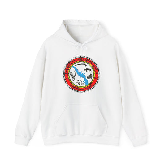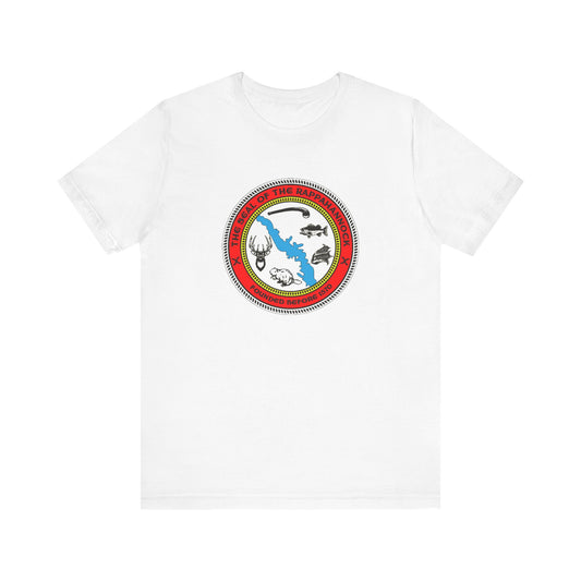 The Seal of the Rappahnnock People prominently features the Rappahannock River flowing through its center, symbolizing the tribe's deep connection to this vital waterway. Surrounding the river are various symbols that represent the tribe's cultural heritage and values.