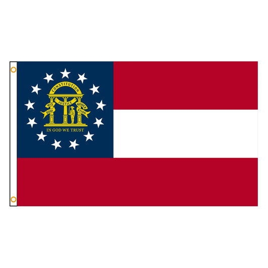 The Georgia state flag showcases a simple yet evocative design that speaks volumes about its values and heritage. Comprised of three horizontal stripes, the top and bottom in a bold red and the middle stripe in pristine white, this layout offers a backdrop to the state's coat of arms, which takes the place of pride in the blue canton. This coat of arms, encased in a circle of thirteen white stars, signifies Georgia's status as one of the original thirteen colonies.