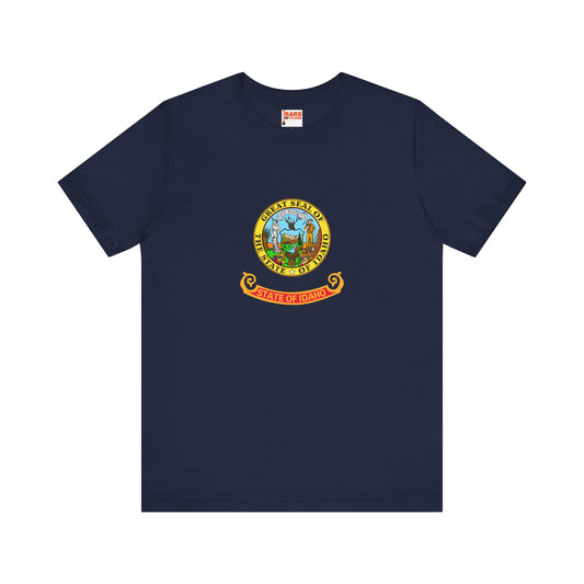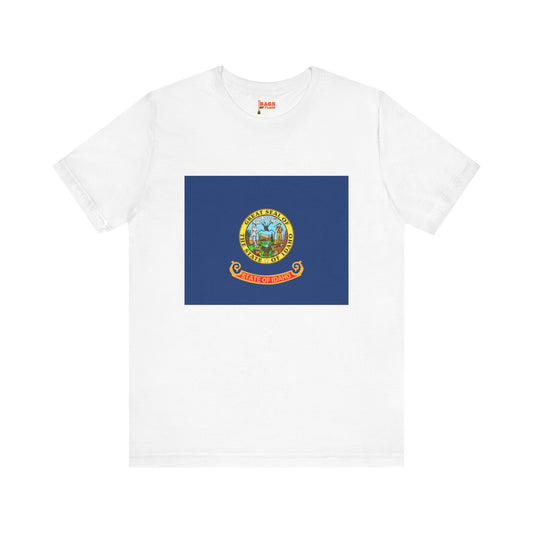 The flag of Idaho is distinguished by a rich blue field that sets the stage for the state seal centered within. Intricate and meaningful seal encapsulates symbols of significant state values and industries—mining, agriculture, and forestry. Surrounding the seal, a red band with gold trim contains the text "State of Idaho" at the top and "1890" at the bottom, marking the year Idaho was admitted to the Union. Each detail on the seal, from the miner and woman symbolizing liberty and justice to the representations of the state’s natural resources and wildlife, tells a story of Idaho’s heritage and aspirations.