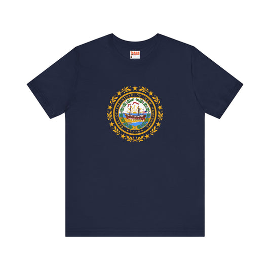 The New Hampshire flag presents a striking image centered around the state seal on a vibrant blue background. This seal depicts a vivid maritime scene - a ship poised on clear waters under a bright, rising sun, indicative of New Hampshire’s rich naval history and optimistic outlook toward the future. Encircling this central tableau are laurel leaves, symbolizing peace and victory, and nine stars that shine as a nod to New Hampshire's role as the ninth state to join the Union.