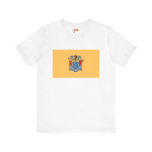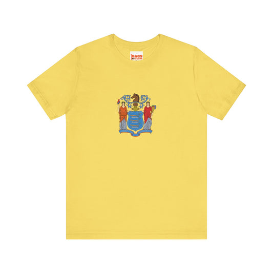 At the heart of the New Jersey flag lies a distinctive design framed by a unique buff-colored background, a shade deeply rooted in the state's Revolutionary War uniforms. The state's coat of arms is central to the flag, a testament to New Jersey's rich heritage and values. Within this emblem, three plows are prominently featured on a shield, a nod to the agricultural prowess and nickname of New Jersey as the "Garden State."