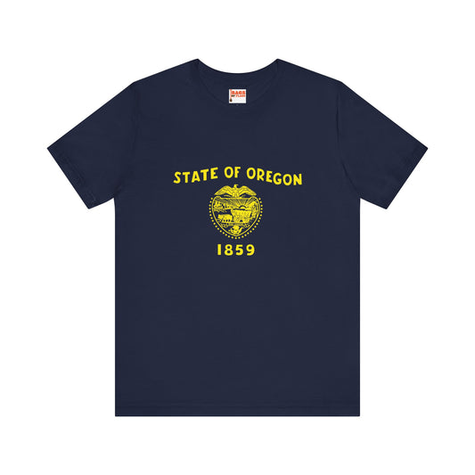 Distinguished by its deep navy blue field and striking gold elements, the Oregon flag presents a visually compelling emblem that encapsulates the state's identity and heritage. Central to the flag's design is a gold shield encircled by 33 stars, a nod to Oregon's admission as the 33rd state in the Union. This emblematic centerpiece is flanked by the state's name and year of statehood, rendered in bold gold.