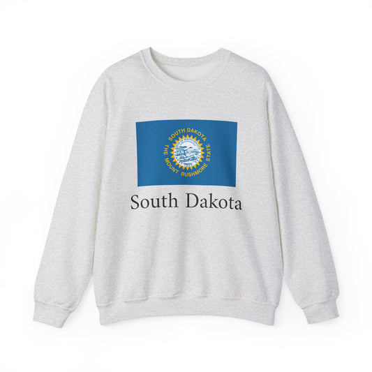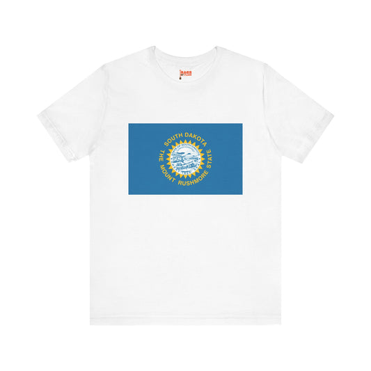 Encircling this tableau are the inscriptions “South Dakota” and “The Mount Rushmore State.” These elements pay homage to the state’s rich resources and dynamic spirit, its significant landmarks, and the pride of its people. The flag's composition, with its bold colors and meaningful imagery, serves as a daily reminder of South Dakota's heritage and the unity of its people under the wide-open skies.
