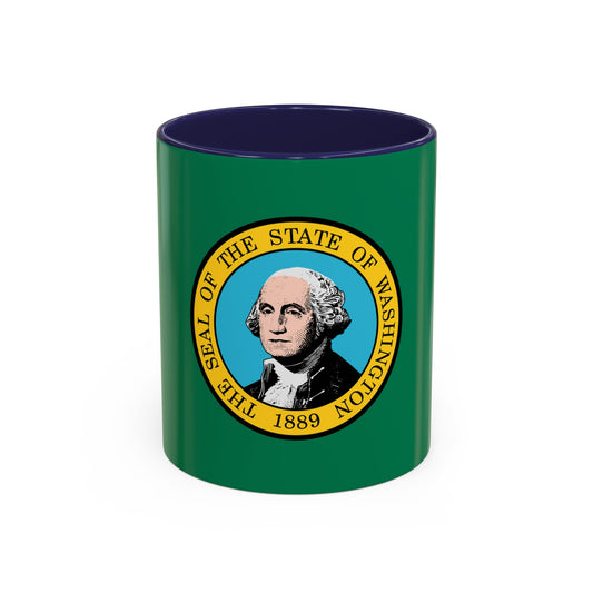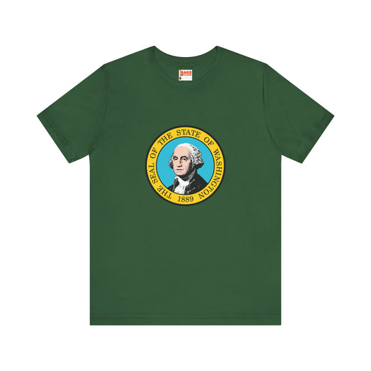 Surrounding this image, the gold circle accentuates the central figure and symbolizes unity and continuity, encapsulating the state's journey from its admission into the Union to its current status. The choice of dark green for the background is intentional, symbolizing the state’s lush landscapes and embodying its nickname, "The Evergreen State." Through these elements, the flag weaves together themes of natural beauty, historical significance, and enduring values, creating a deeply meaningful symbol for the people of Washington. This symbolism reinforces a sense of identity and pride among its residents, connecting them to their state's unique heritage and the broader narrative of the American spirit.