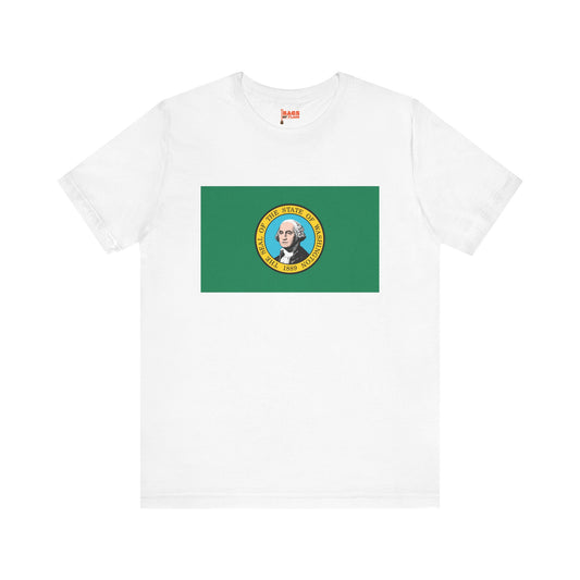 Centered upon a vibrant field of dark green, the Washington flag proudly displays the state seal, which captures a detailed likeness of George Washington, the nation’s inaugural President. This central image is encased within a gold circle, bearing the inscription "The Seal of the State of Washington 1889," marking the year the state joined the Union. This specific shade of green serves as a backdrop and a tribute to Washington’s moniker, "The Evergreen State," reflecting its abundant natural forests and verdant landscapes. Unlike many state flags, Washington’s flag uniquely incorporates the image of a U.S. President, symbolizing a direct connection to the country's early leadership and foundational ideals. The dark green and gold color scheme further enhances the flag's visual appeal, ensuring it stands out with distinction among the array of state flags.