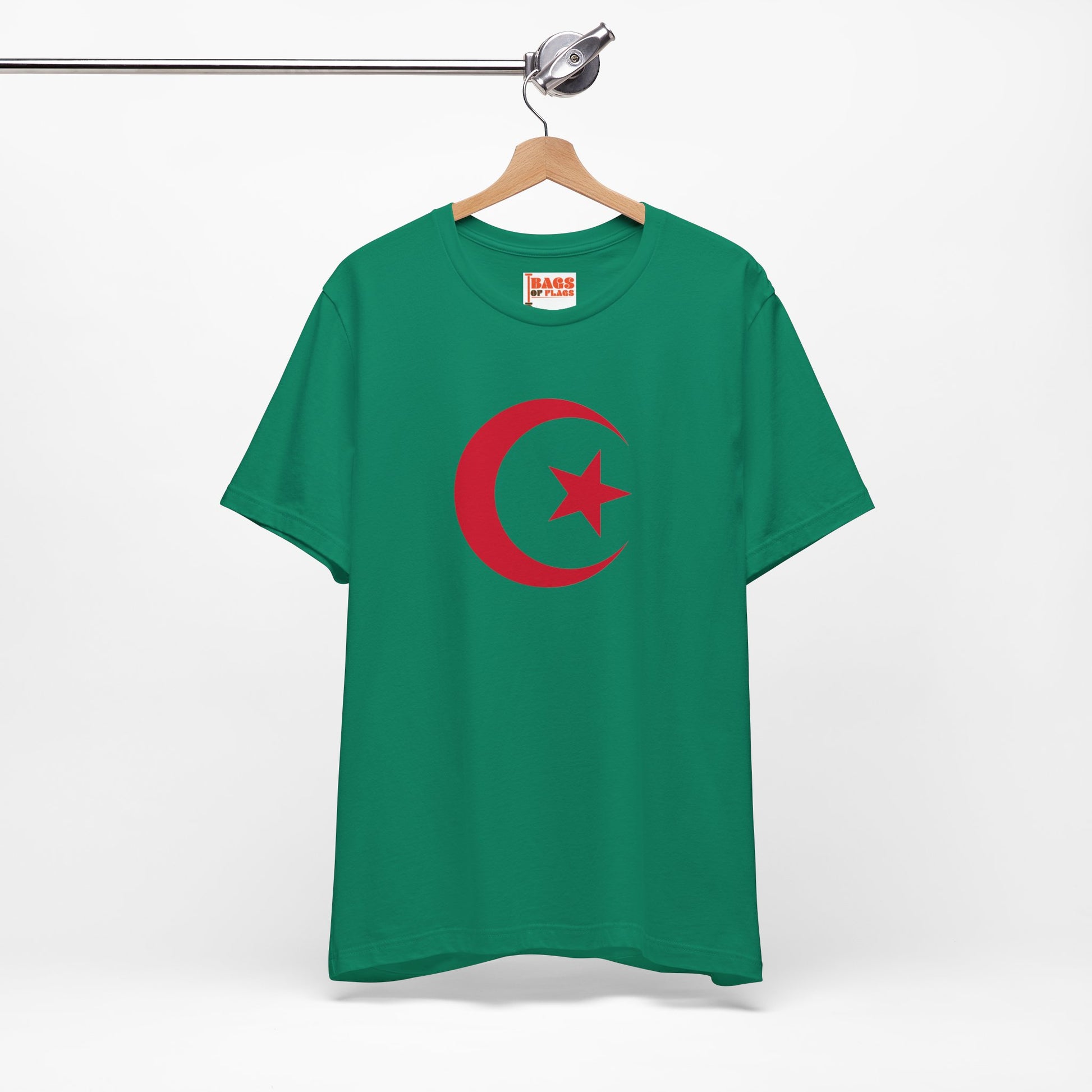 This design draws from the iconic elements of Algeria’s national flag — green for the land and Islamic heritage, white for peace, and the red crescent and star representing sacrifice and faith. It’s more than just a shirt — it’s a proud nod to a complex and beautiful history.