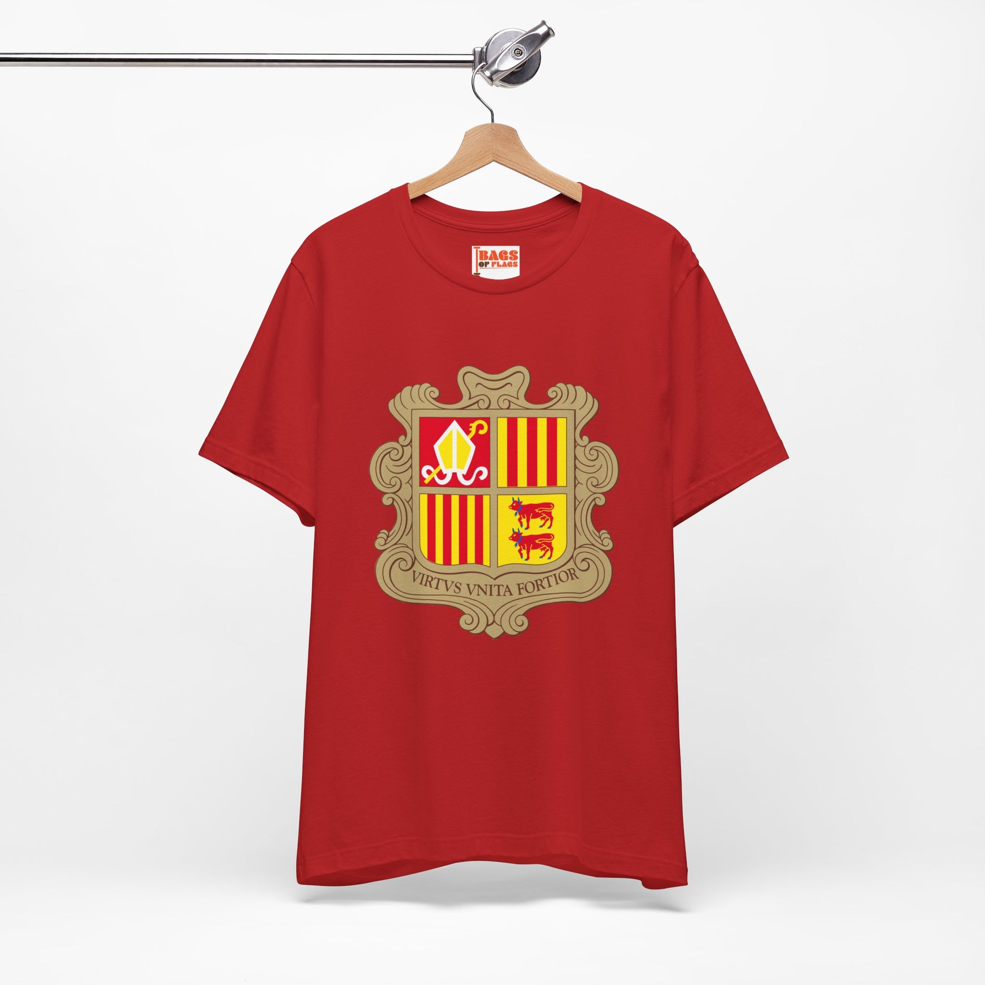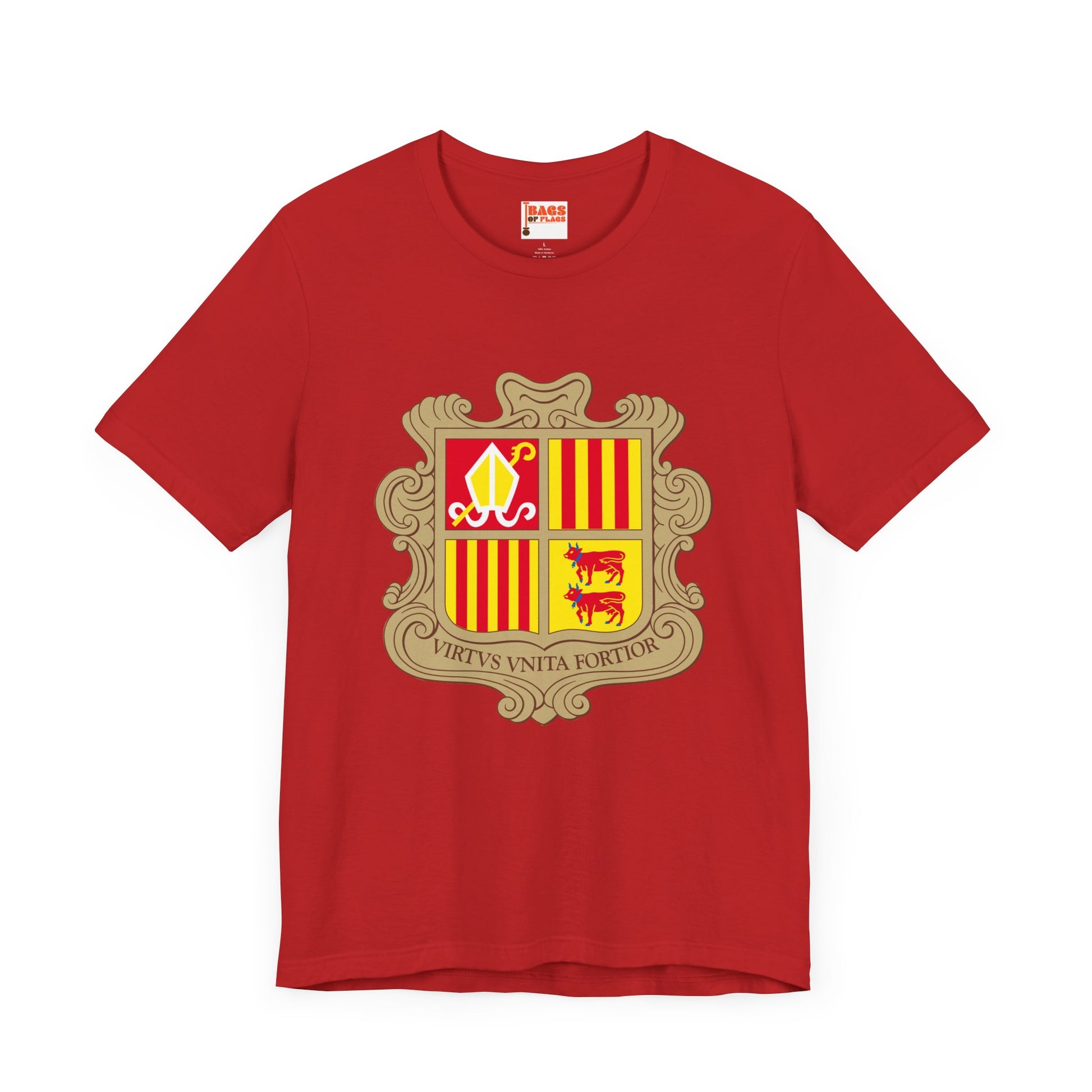 The Andorran coat of arms dates back centuries and reflects the country’s dual leadership and deep cultural ties to both France and Spain. Each quadrant of the shield—religious, regional, and noble—tells a story of protection, diplomacy, and identity. Wearing this T-shirt is more than repping a flag—it's wearing history.