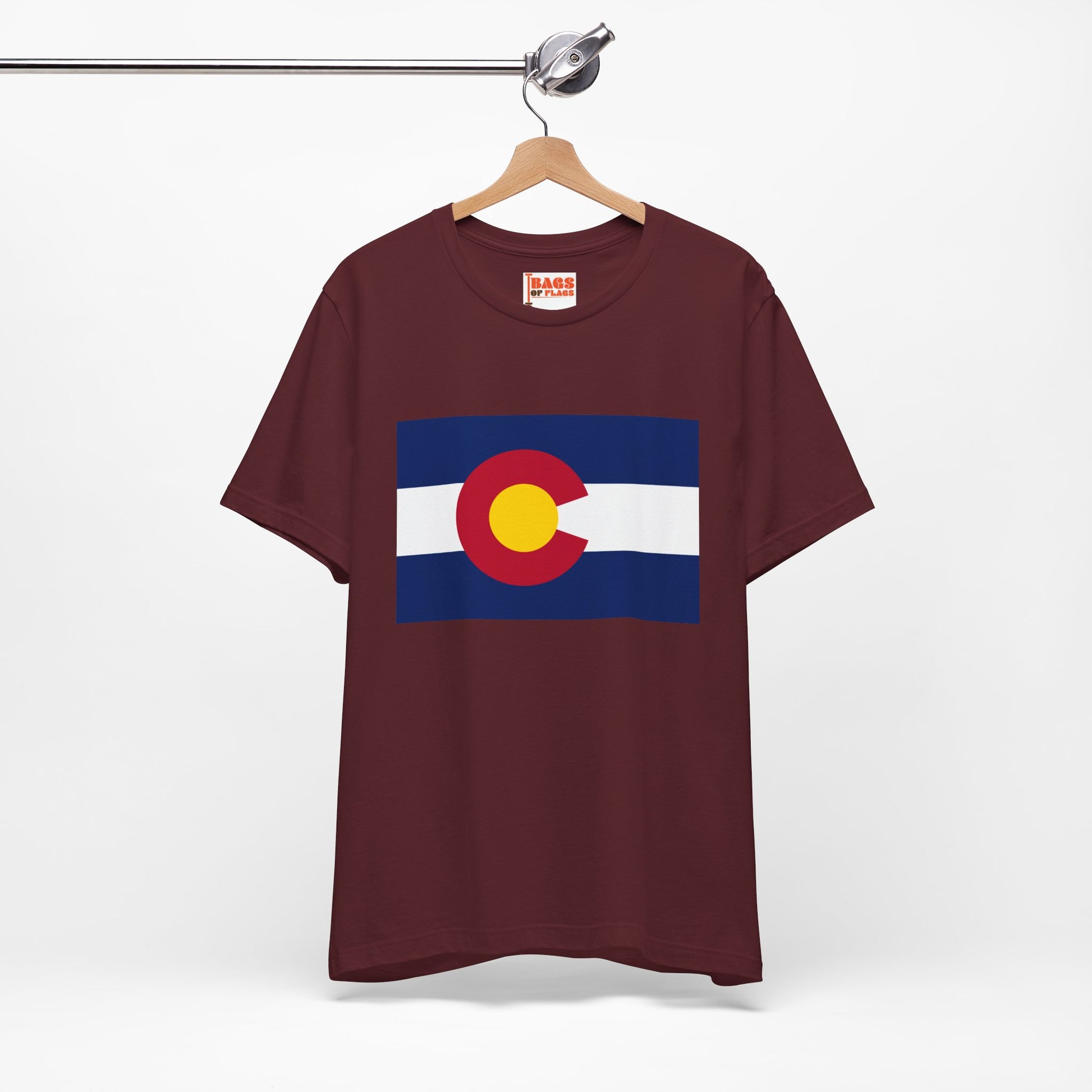 The Colorado Flag T-shirt proudly represents the state’s identity and natural beauty. The red “C” symbolizes the state’s red soil, while the golden disc reflects abundant sunshine. The blue stripes represent Colorado’s clear skies, and the white stripe mirrors the snow-capped Rocky Mountains. Wearing this tee is a nod to Colorado’s landscapes, heritage, and adventurous spirit.