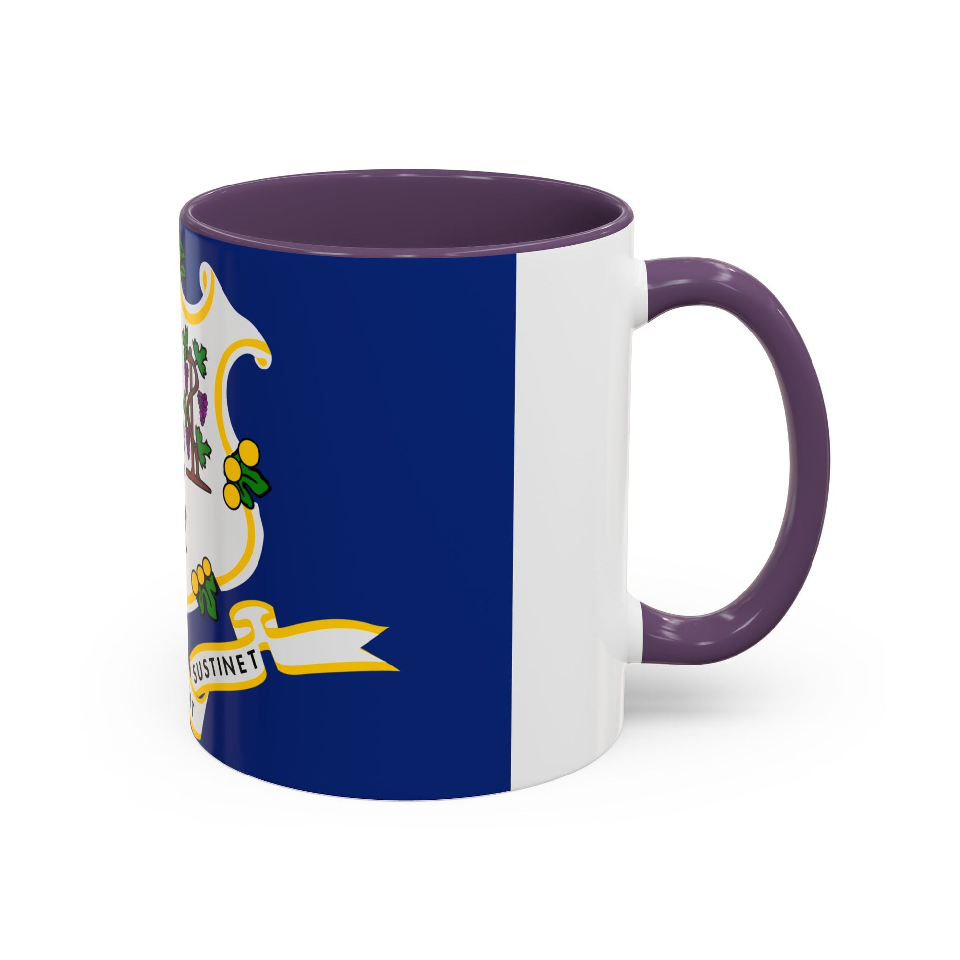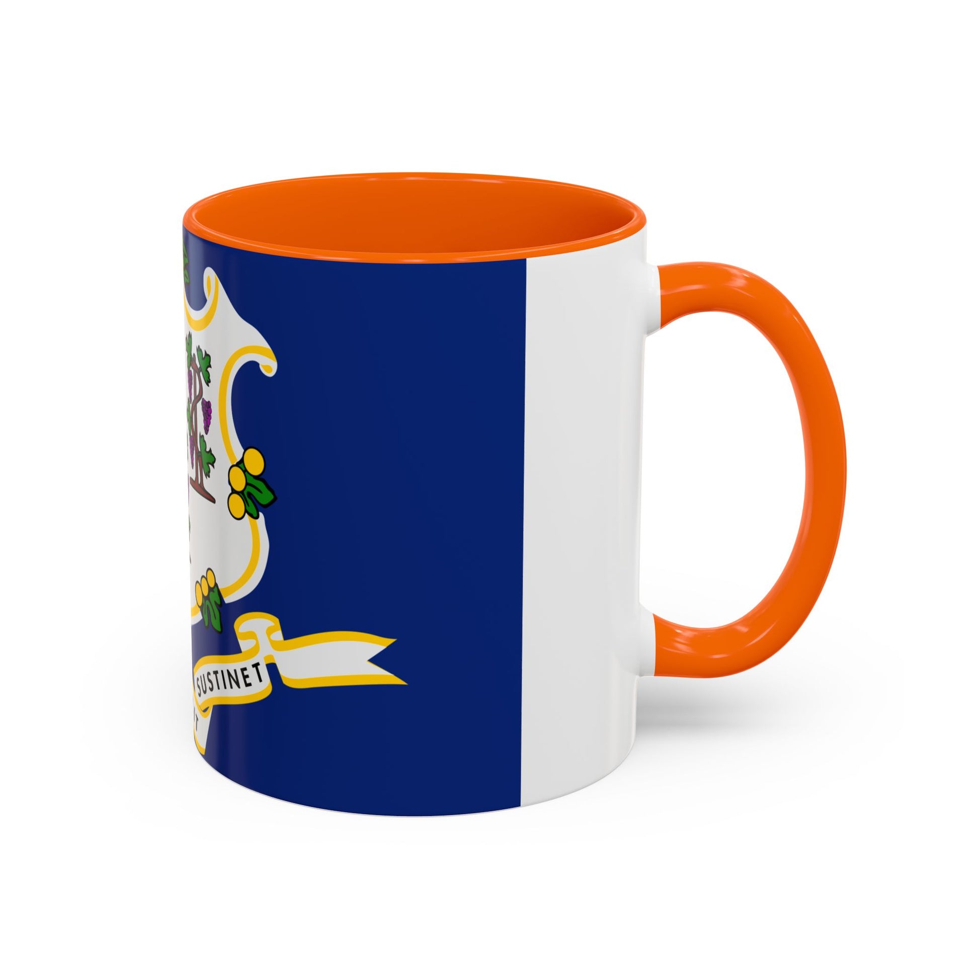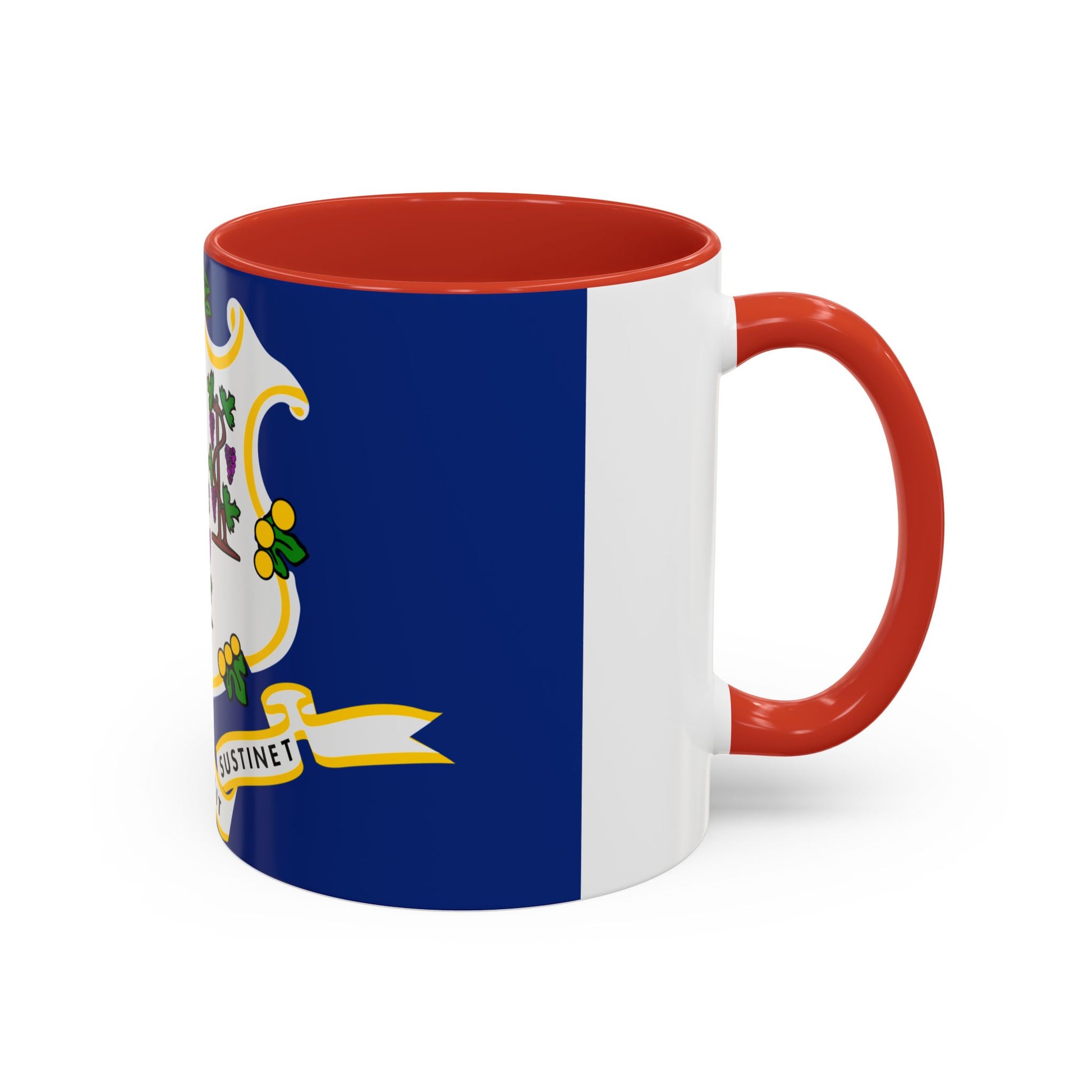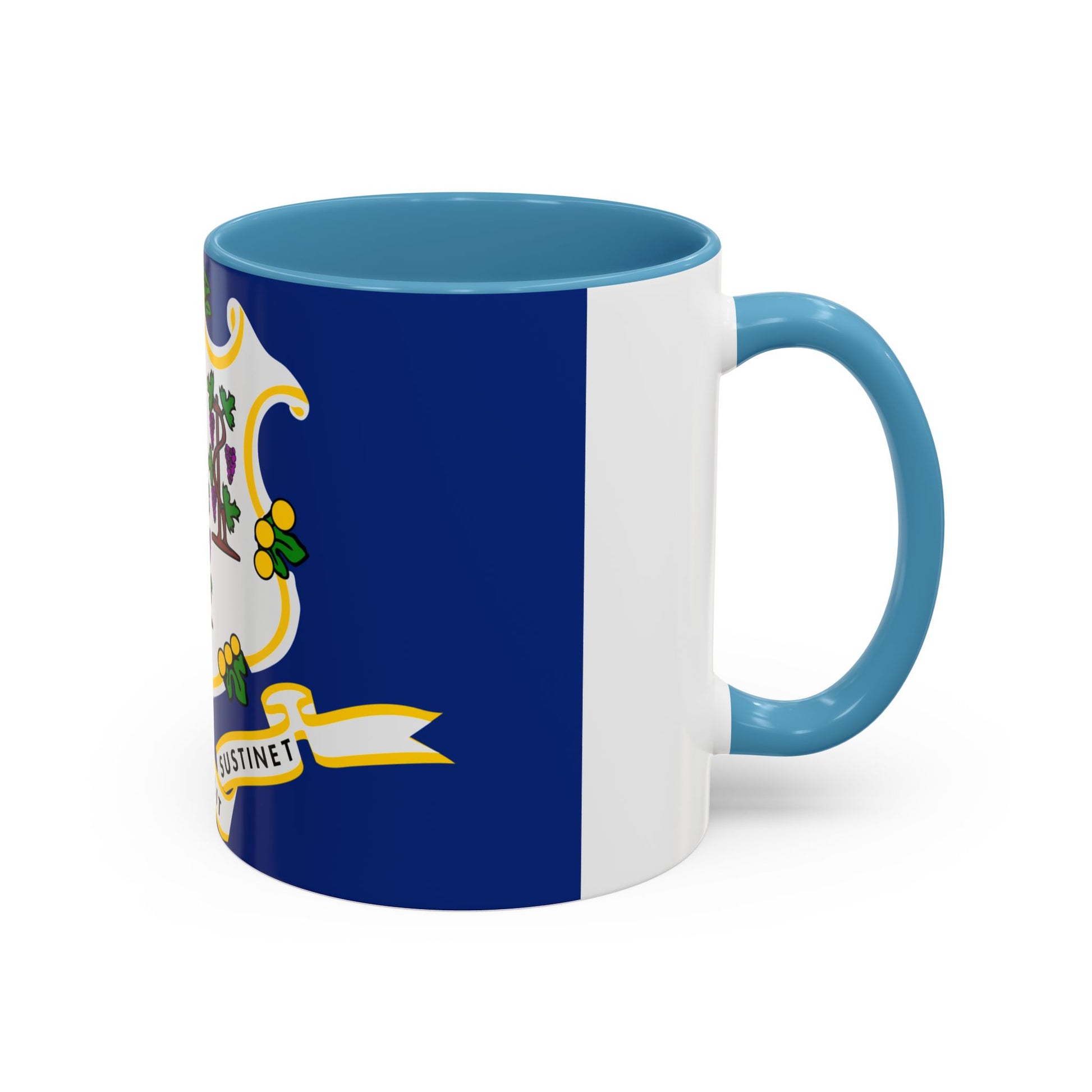 Add a touch of New England charm to your daily routine with the Connecticut Mug. Featuring the Connecticut state flag, this mug showcases a deep blue field with a white baroque shield bearing three grapevines, each laden with fruit. Beneath the shield lies a flowing banner with the state motto, “Qui Transtulit Sustinet,” meaning “He who transplanted sustains.” Whether you’re from the Constitution State or simply appreciate its rich history, this mug makes every sip feel connected to Connecticut’s legacy.