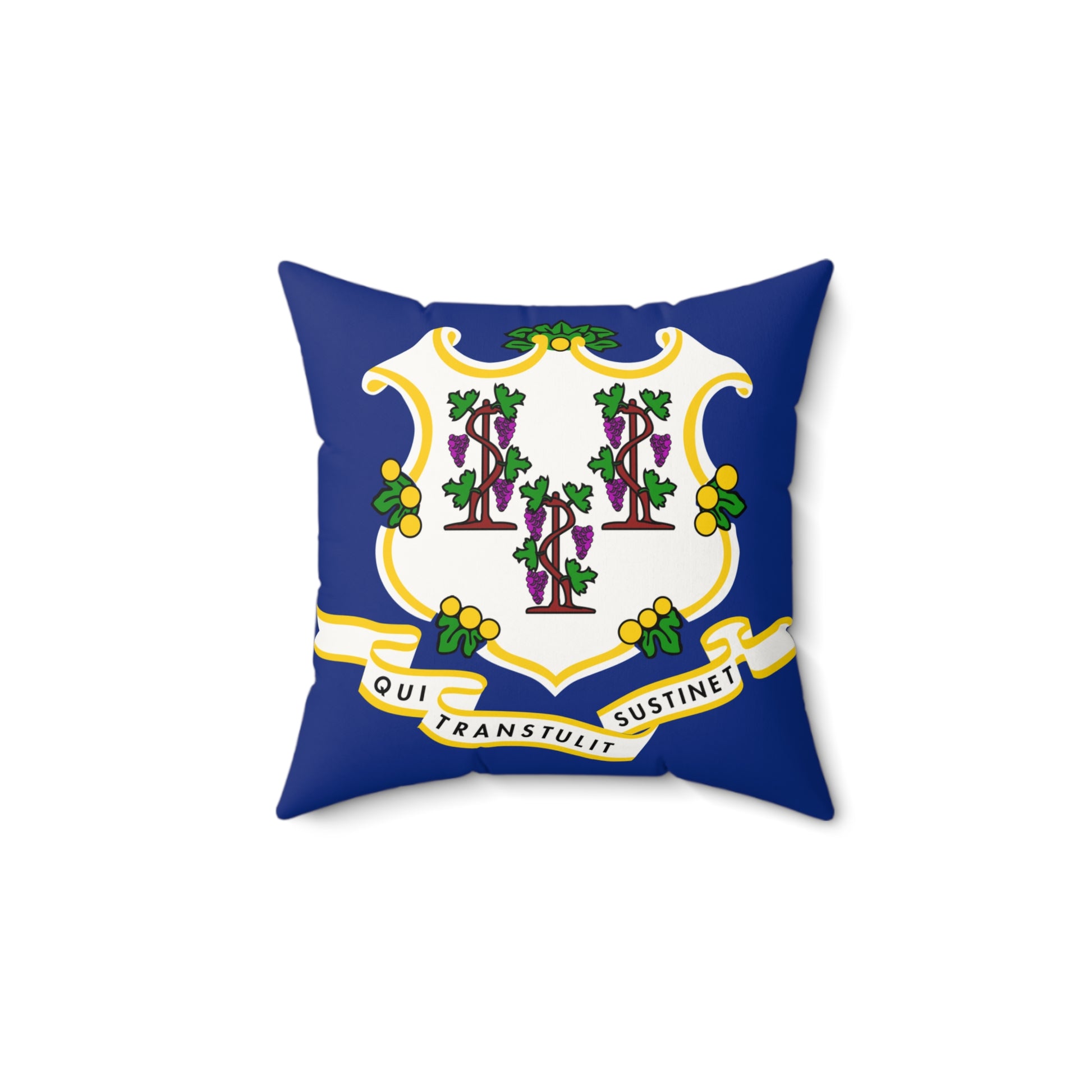 The Connecticut flag reflects the state’s history and values. The blue field symbolizes loyalty and justice, while the three grapevines represent the first three settlements in Connecticut: Windsor, Wethersfield, and Hartford. The grapevines also signify growth and prosperity. The white banner below the shield carries the state motto, Qui Transtulit Sustinet (“He who transplanted sustains”), honoring Connecticut’s enduring strength and heritage.