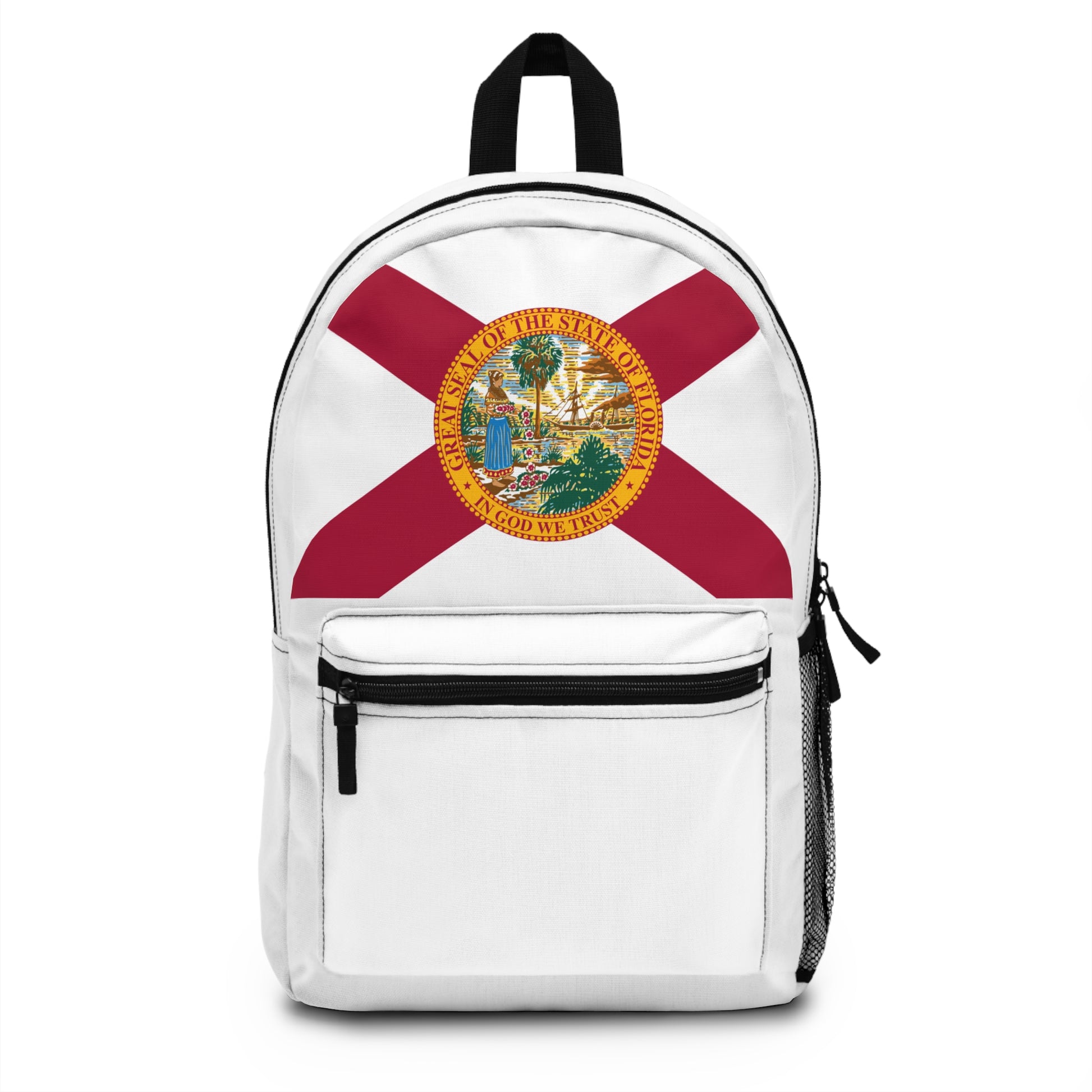 Bring a bit of sunshine with you wherever you go with the Florida Backpack, inspired by the vibrant Florida state flag. Its bold red cross and detailed state seal stand out beautifully against a crisp white background, capturing the warmth, history, and natural beauty of the Sunshine State. Whether you’re relaxing on the coast, exploring the Everglades, or heading to class, this backpack keeps your essentials close while showing off your Florida pride.