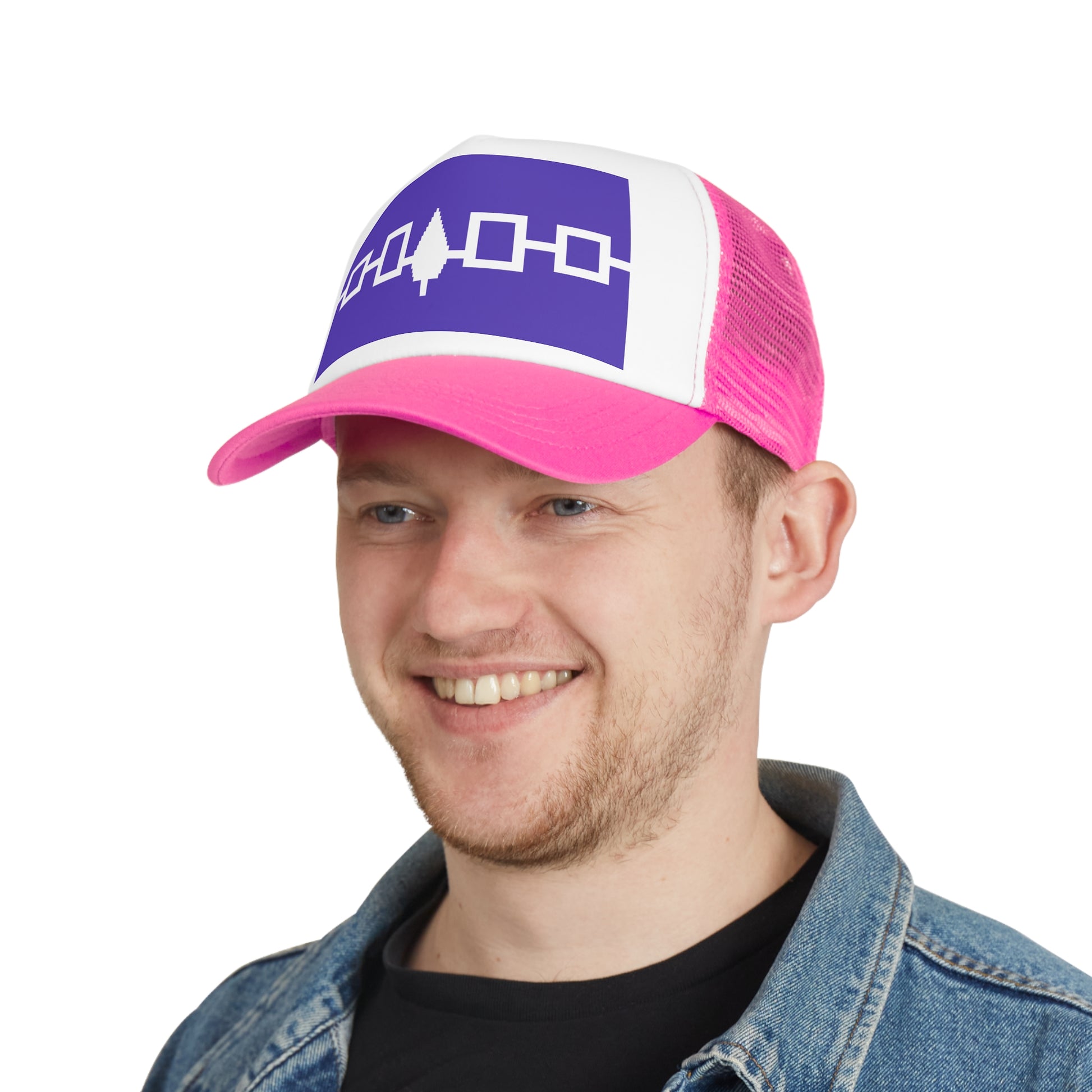 Celebrate the legacy and unity of the Haudenosaunee Confederacy with the Haudenosaunee Trucker Cap — a meaningful tribute to one of the oldest continuous democracies in the world. Crafted for comfort and designed with cultural respect, this cap features a structured front, breathable mesh backing, and a timeless curved bill that makes it perfect for everyday wear. It offers a modern way to honor ancestral tradition, sovereignty, and shared governance among the Six Nations.