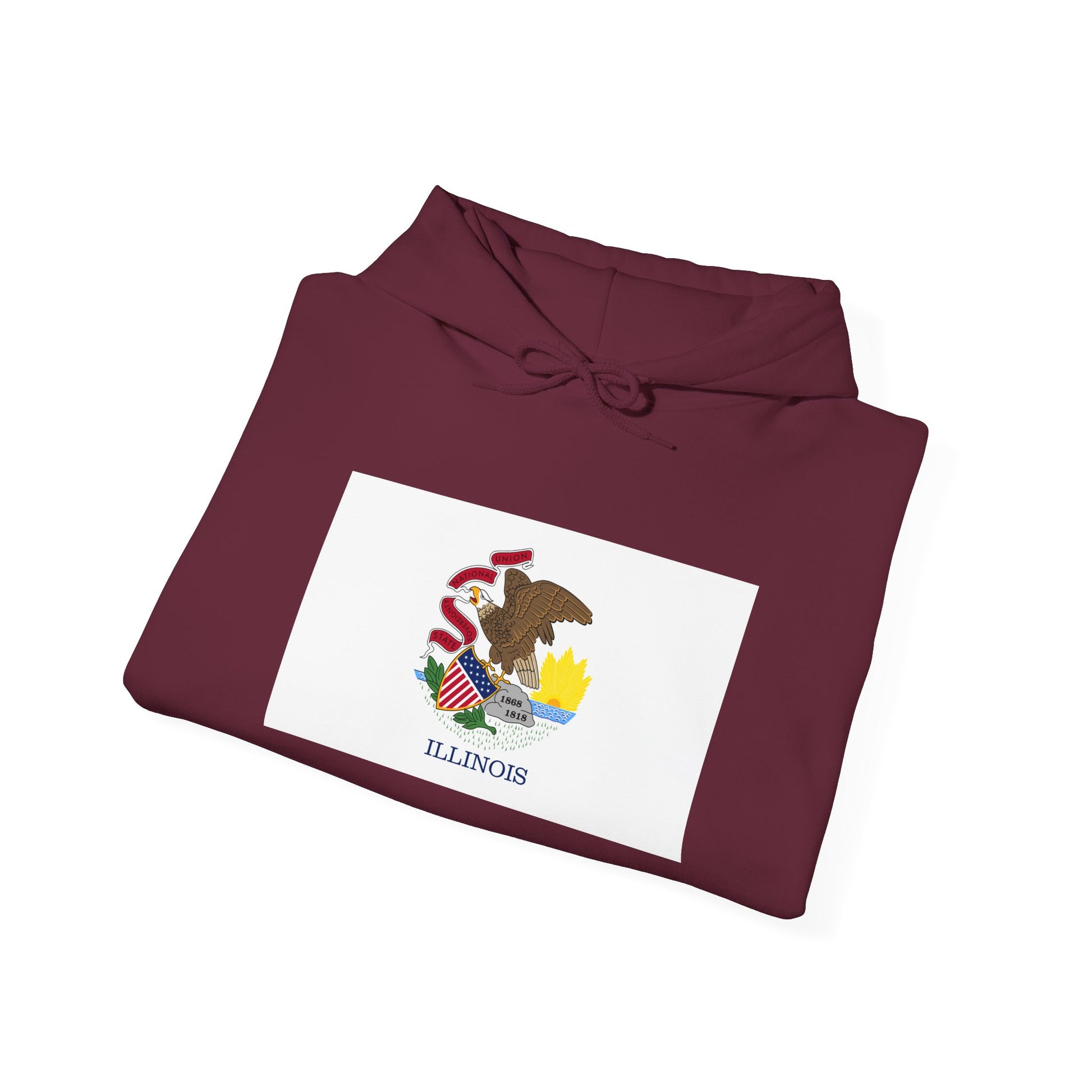 The Illinois state flag features a bald eagle grasping a shield, banner, and olive branch—representing the strength and sovereignty of the United States, along with Illinois’ commitment to peace and liberty. The detailed crest design carries deep historical and patriotic meaning, making this hoodie more than just apparel—it's a proud declaration.