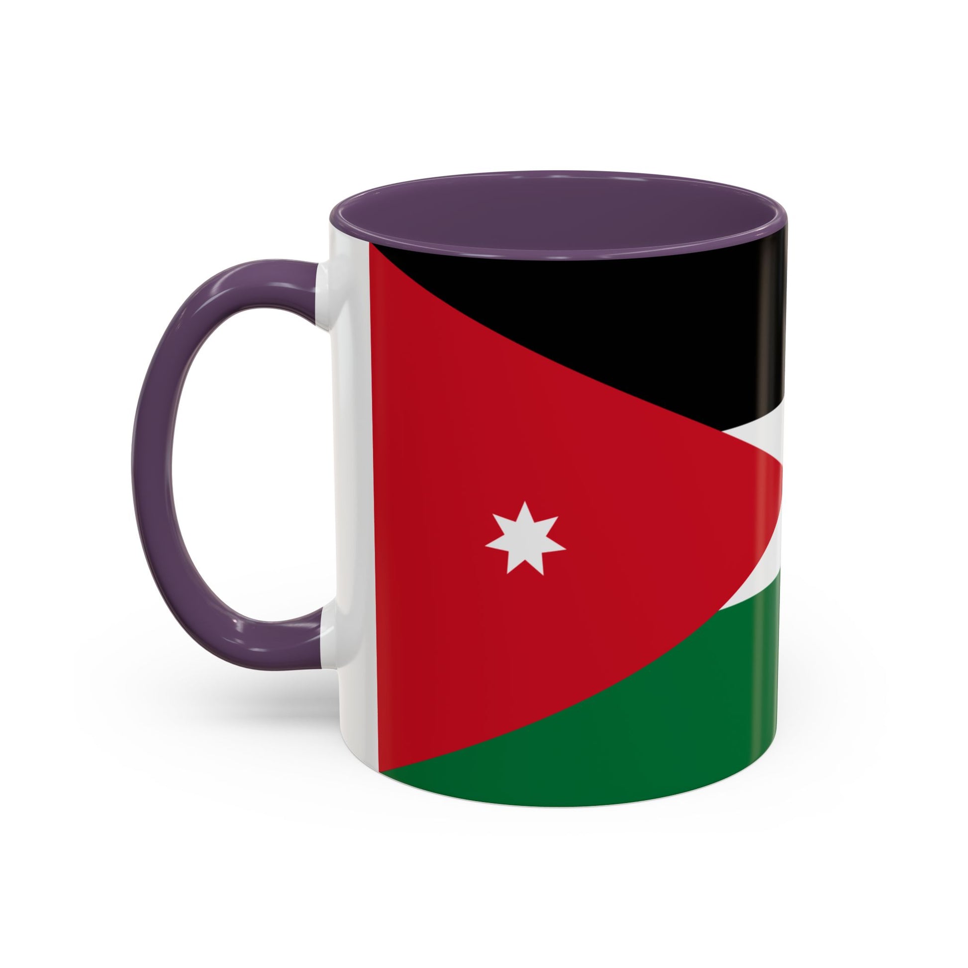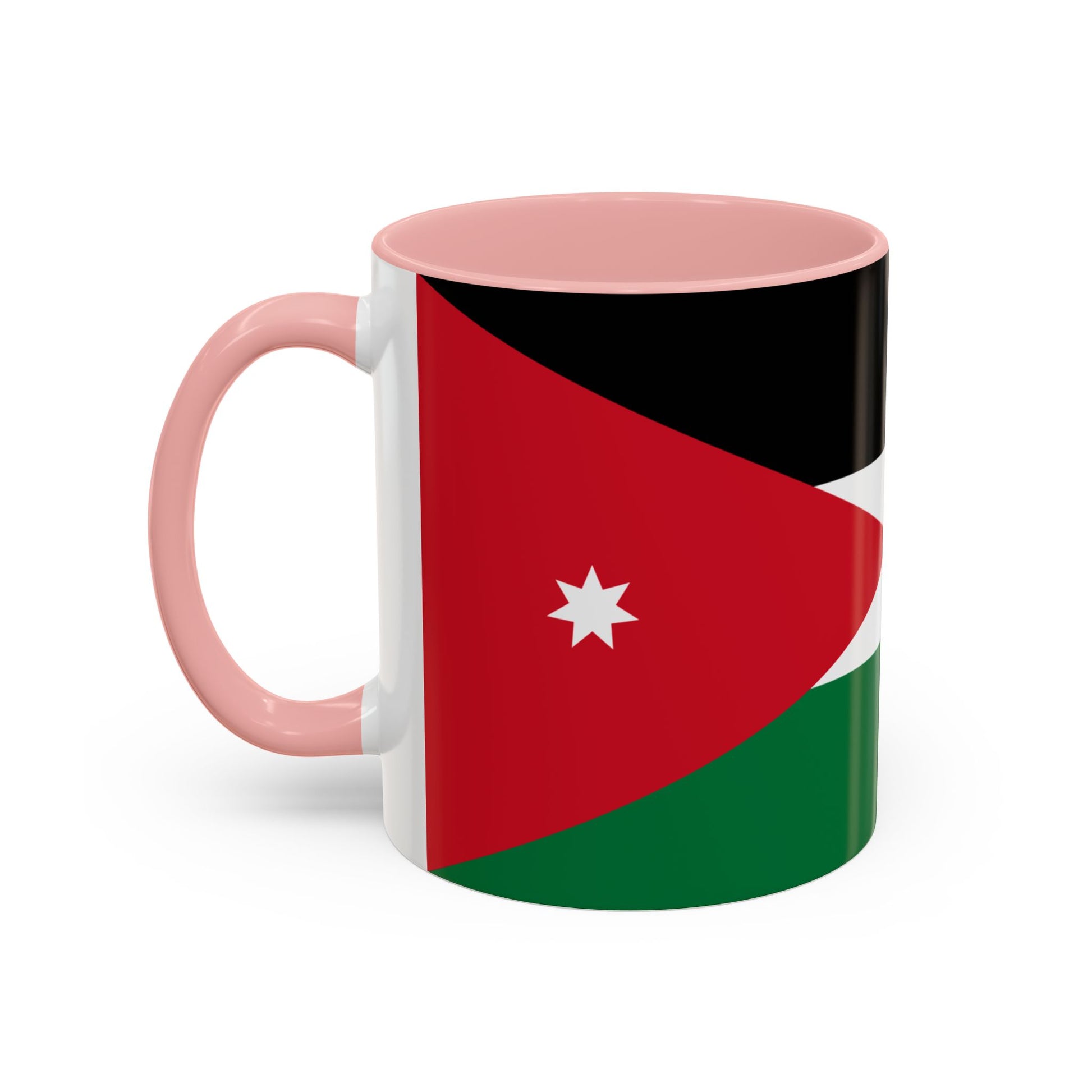 The flag of Jordan consists of horizontal black, white, and green stripes, with a red chevron on the hoist side containing a white seven-pointed star. Black represents the Abbasid Caliphate, white symbolizes the Umayyad Caliphate, and green stands for the Fatimid Caliphate. The red chevron signifies the Great Arab Revolt, and the star represents unity and the seven verses of the first surah of the Quran. The Jordan Mug lets you enjoy these powerful symbols of history and national identity with every drink.