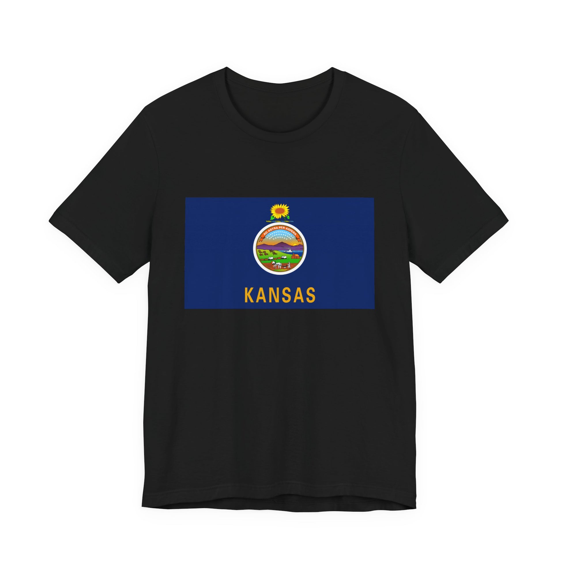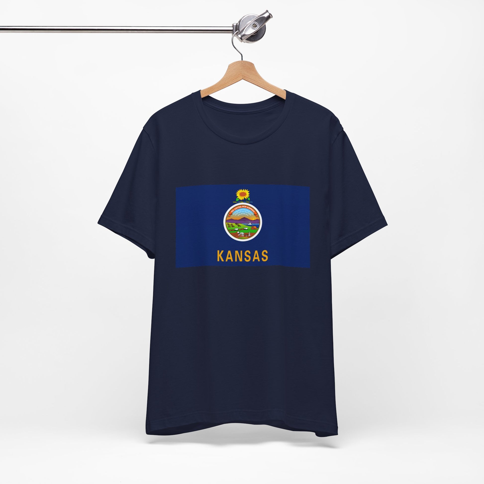 Crafted from 100% US-grown cotton, the shirt feels soft yet sturdy—a dependable classic. The smooth surface allows the flag’s vibrant details to stand out, from the rising sun and riverboat to the state’s proud motto: Ad astra per aspera (To the stars through difficulties). With a relaxed fit, taped shoulders, and no itchy side seams, it’s ready for anything from backyard BBQs to road trips across the prairie.