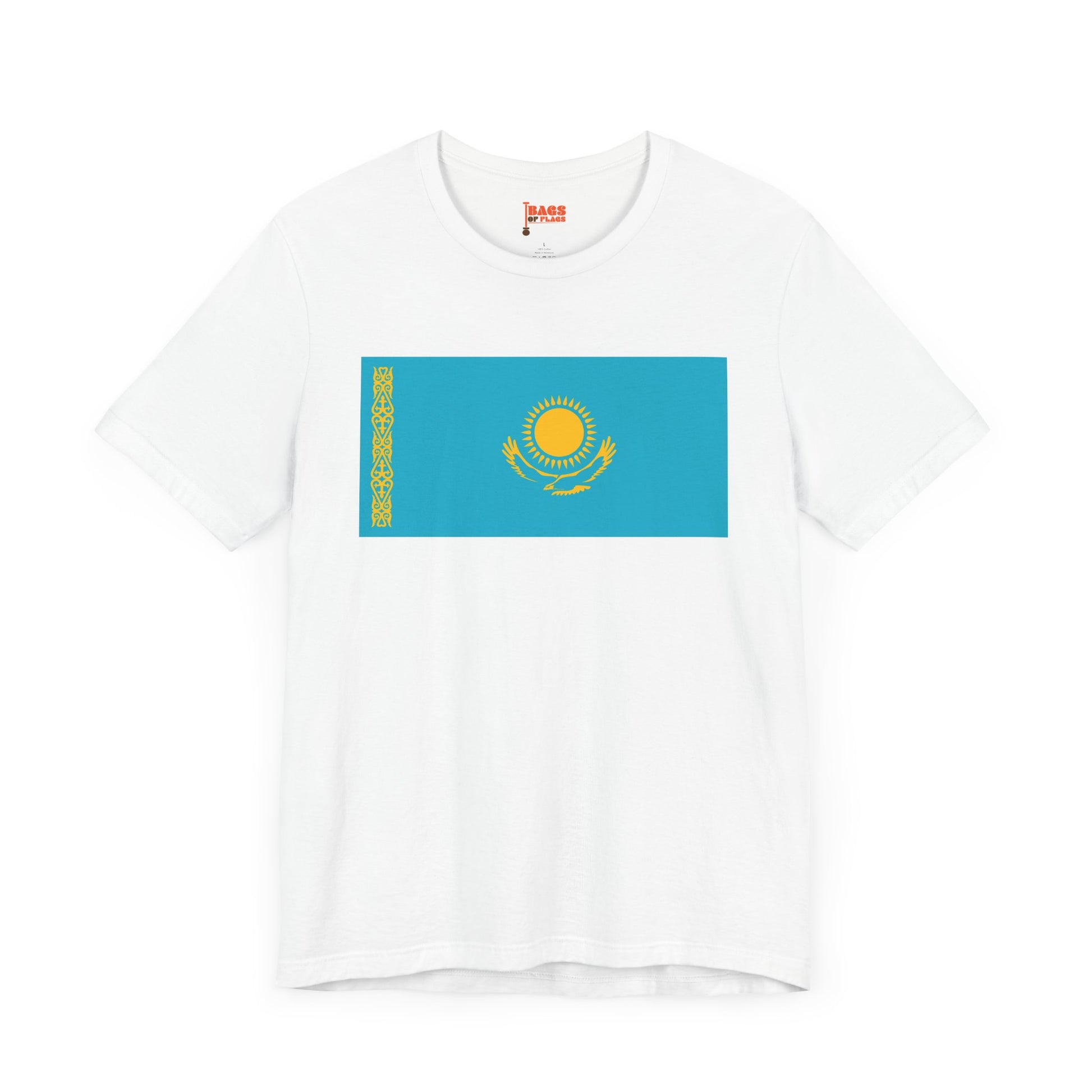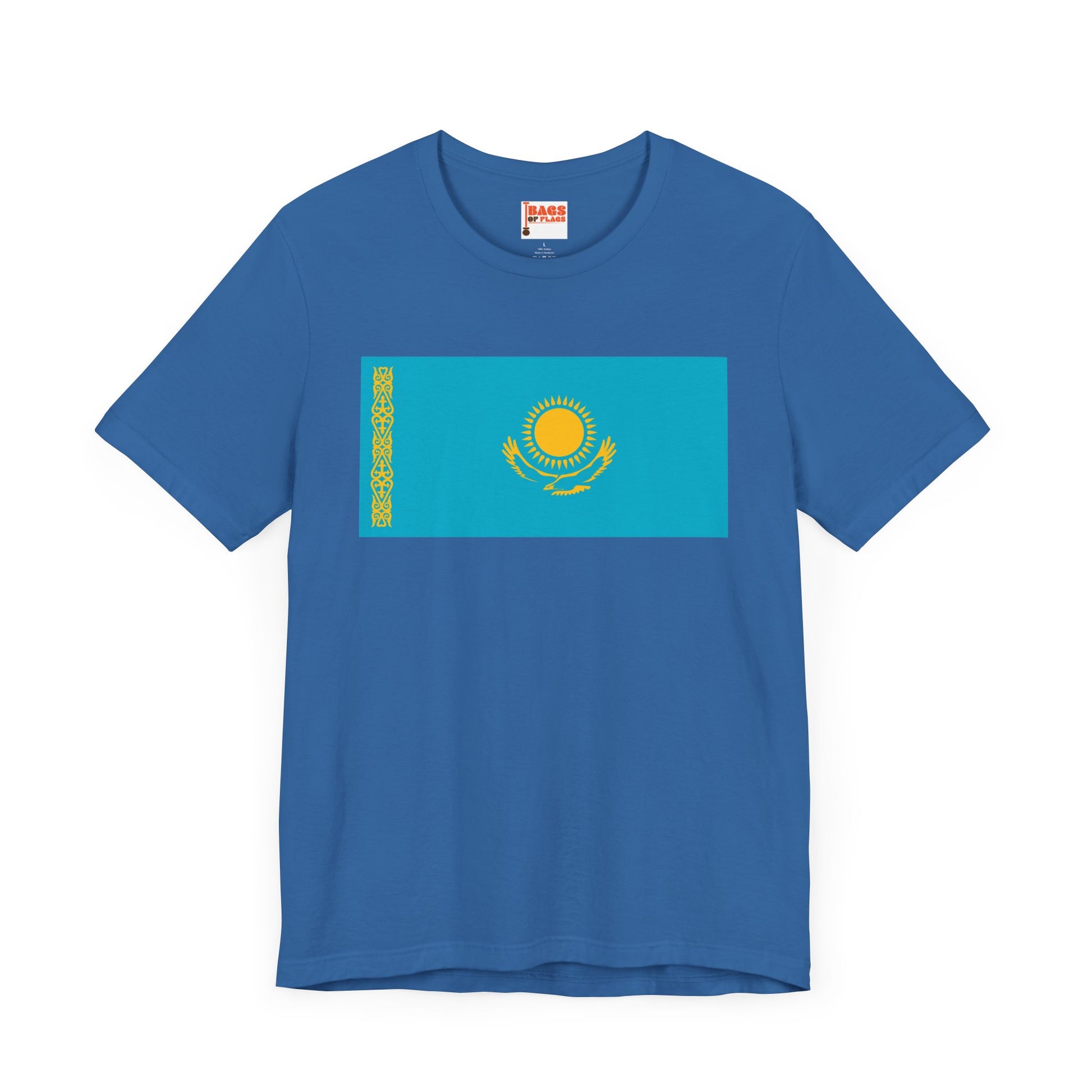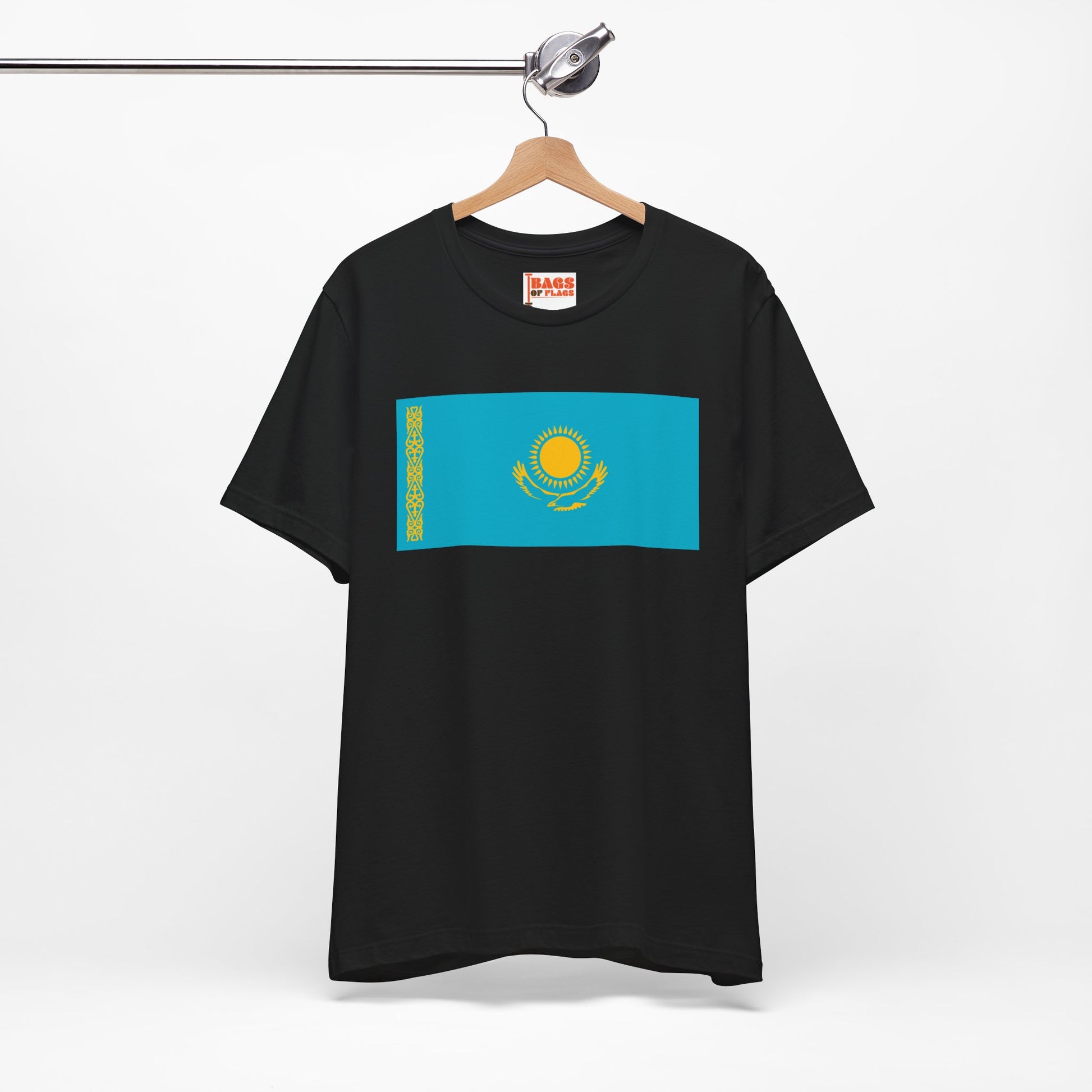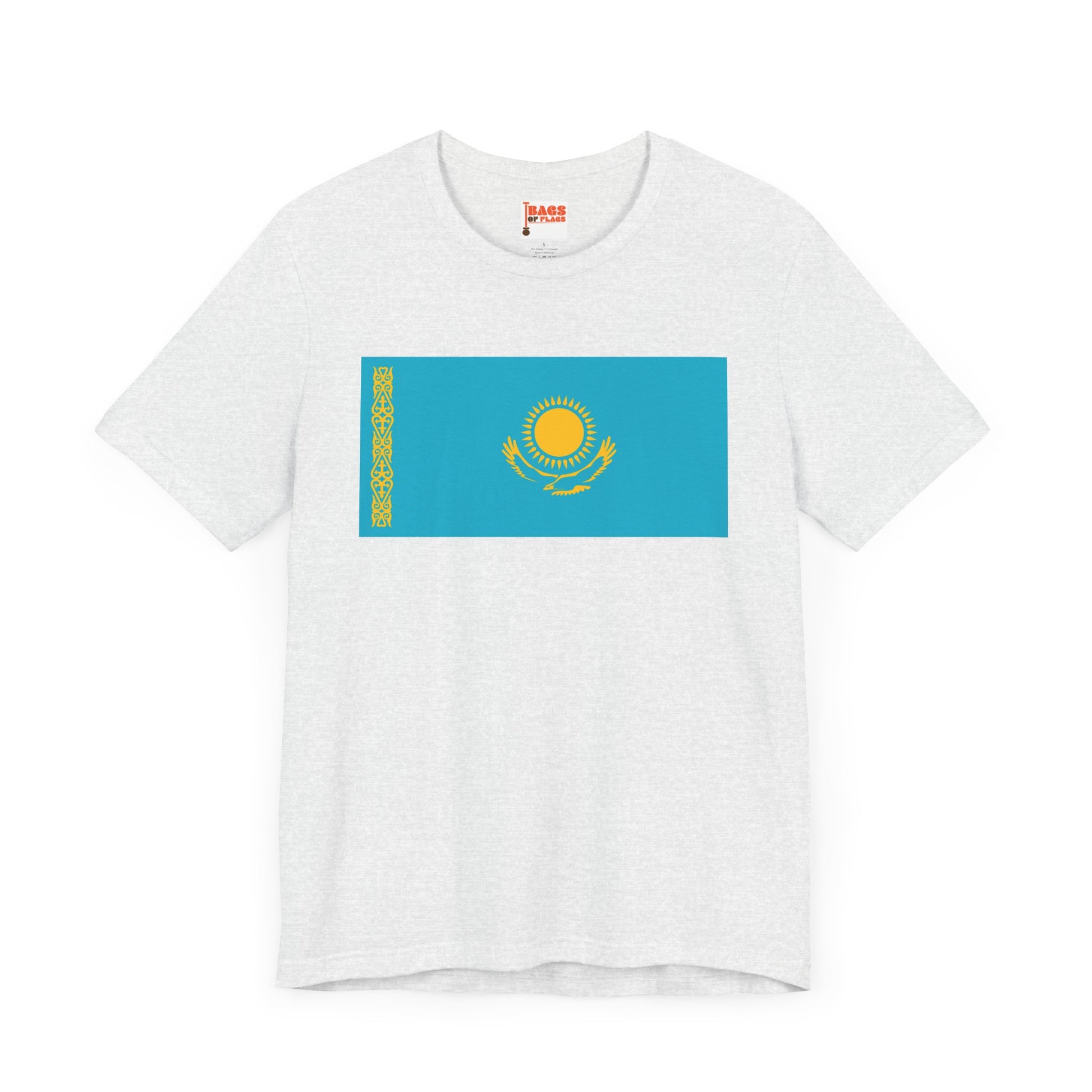 Celebrate the bold spirit and vibrant culture of Central Asia with the Kazakhstan Flag on T-shirt. This unisex heavy cotton tee showcases the iconic Kazakhstan flag—a golden sun above a soaring steppe eagle, set against a sky-blue backdrop and accented by the intricate national ornament on the side. It’s more than just a flag shirt—it’s a wearable tribute to Kazakh identity, freedom, and tradition.