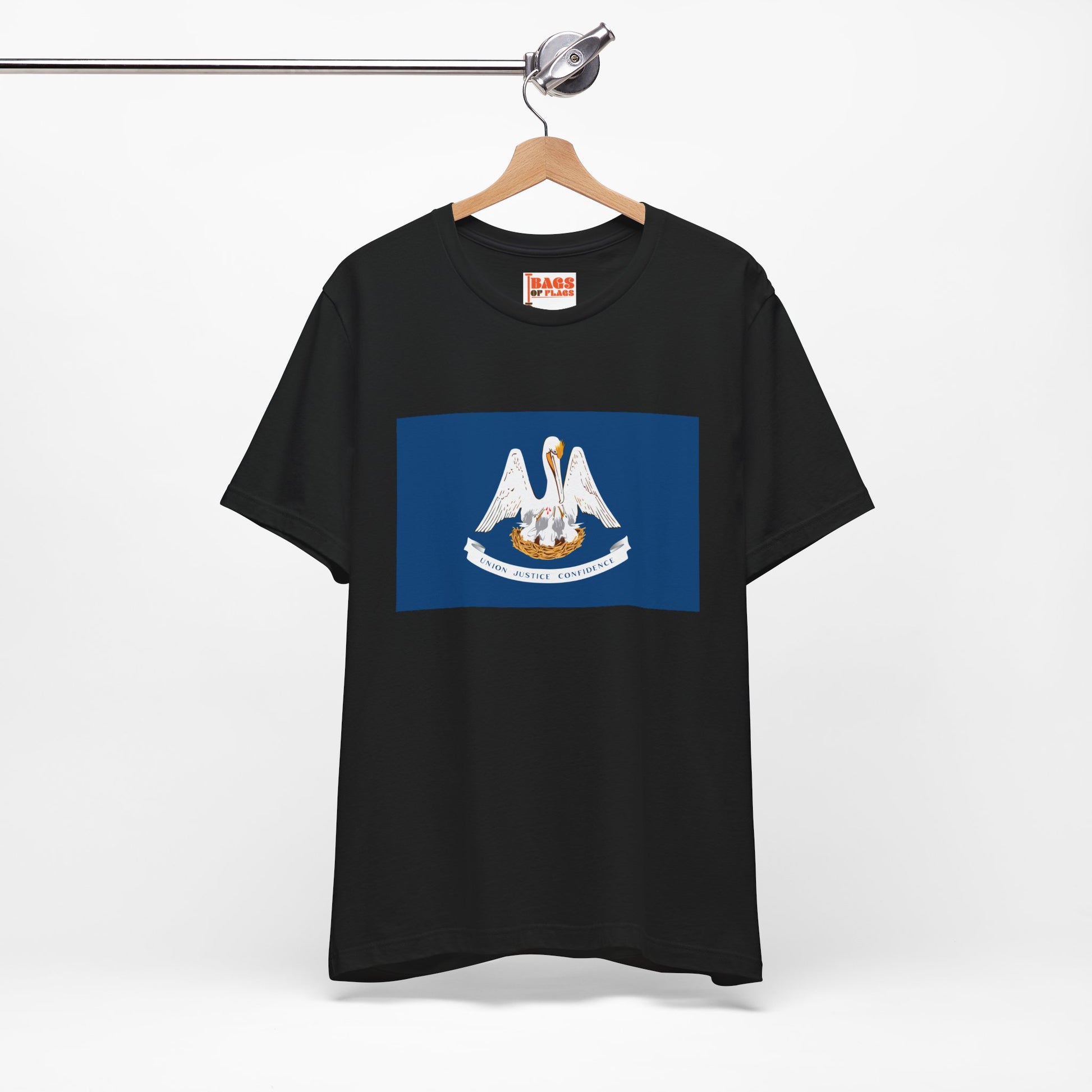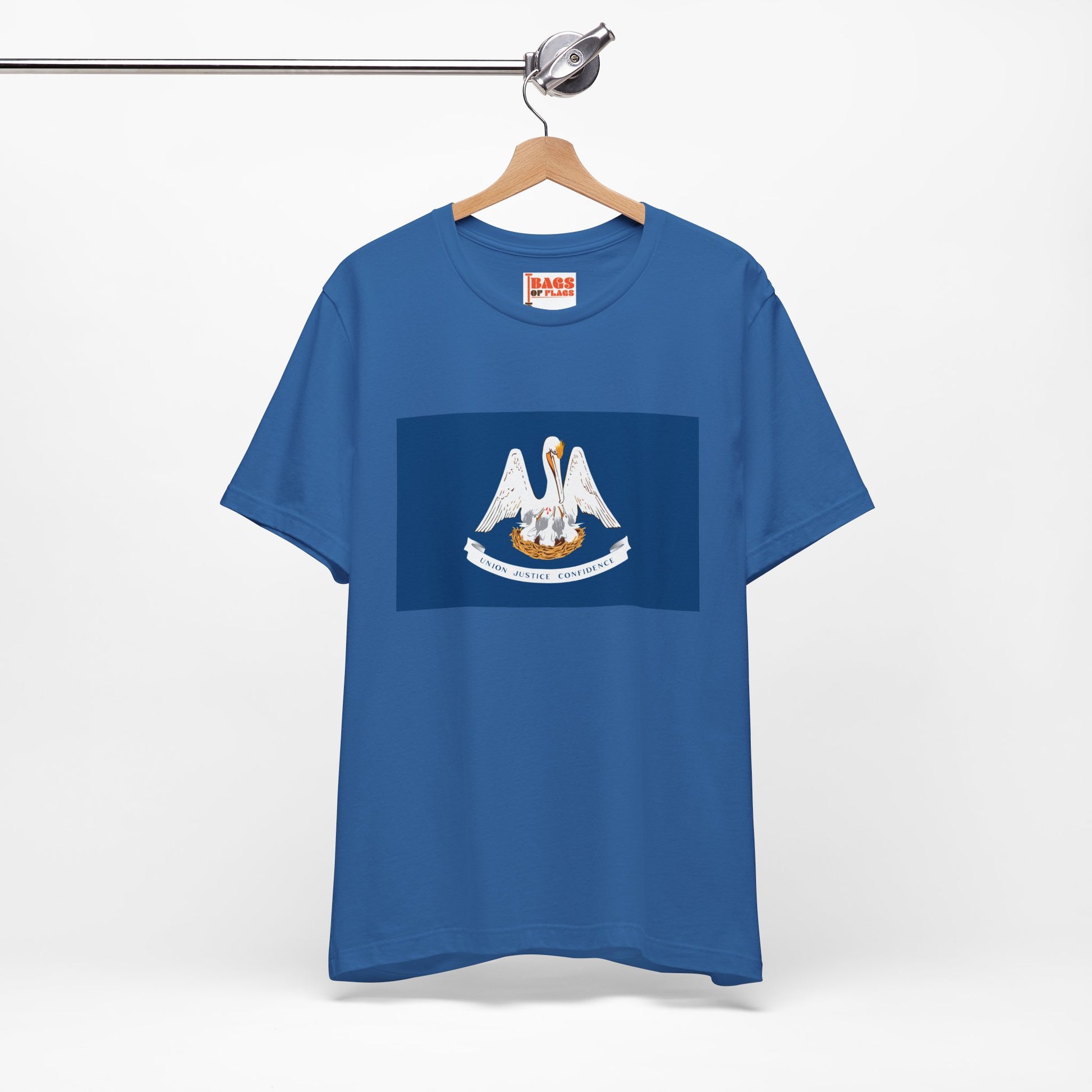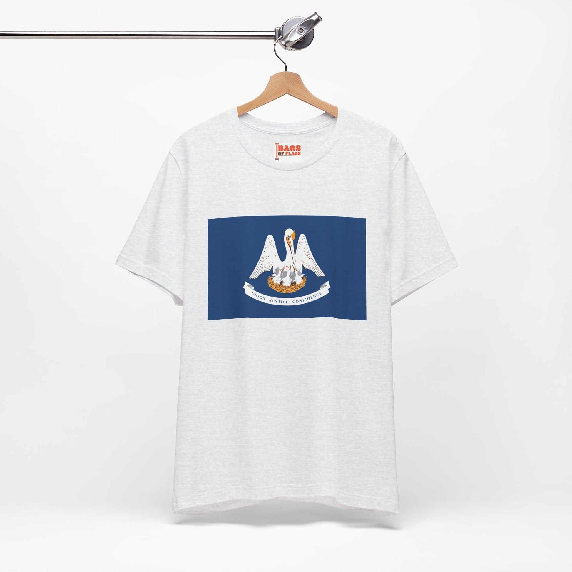 Made from 100% US-grown cotton, this tee is soft, breathable, and built to last, whether you're enjoying a crawfish boil, strolling through the French Quarter, or just repping Louisiana wherever life takes you. The smooth cotton surface makes the vibrant flag design pop—from the mother pelican feeding her young to the state’s motto “Union, Justice, Confidence.” With no itchy side seams, a tear-away label, and a classic unisex fit, it’s the kind of shirt you’ll want to wear on repeat.