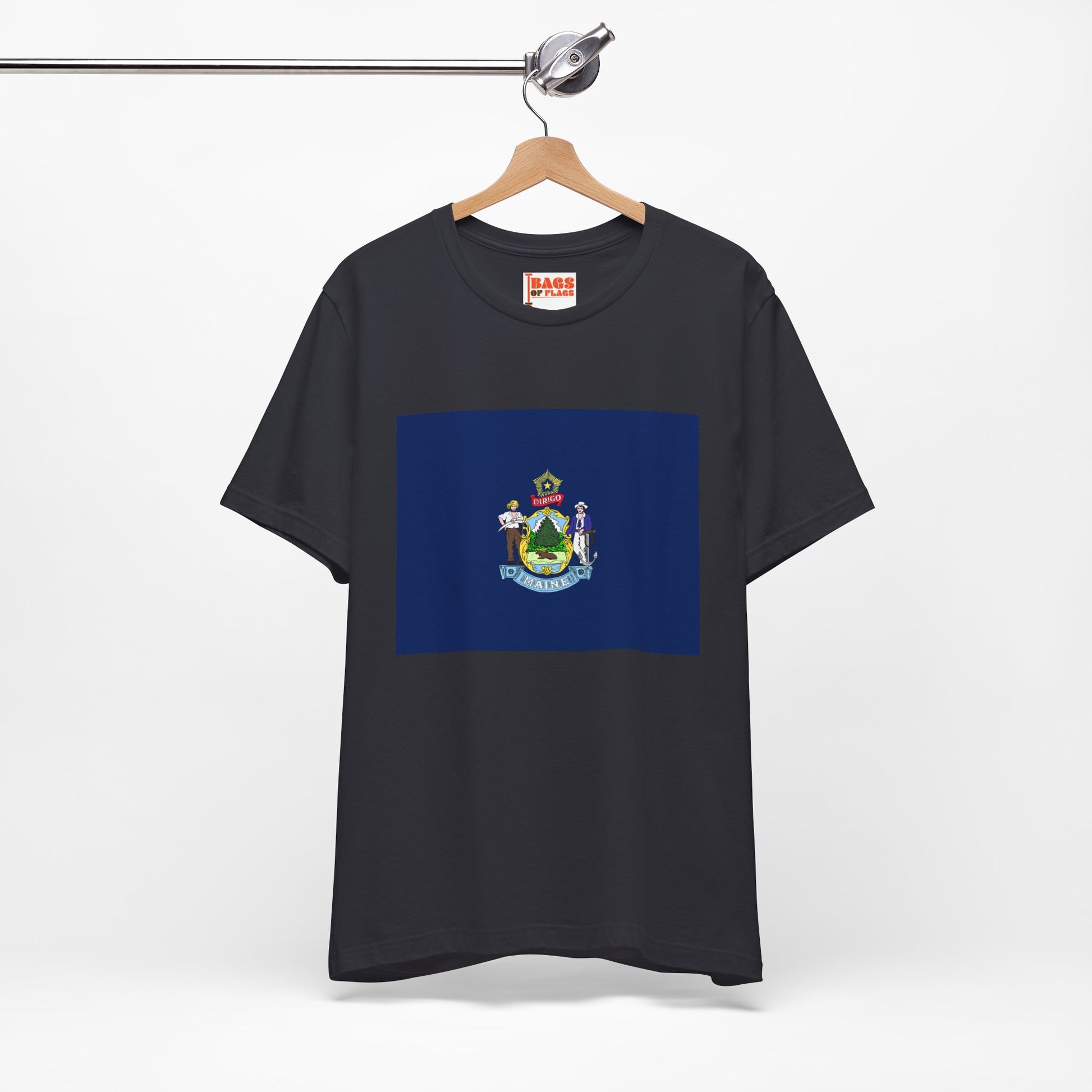 The Maine state flag is rich with symbolism: the towering pine tree represents the state’s vast forests, the moose embodies local wildlife, and the farmer and seaman figures pay homage to Maine’s traditional industries. The blue field echoes the Atlantic Ocean that shapes the state’s character. Wearing this tee means carrying the spirit of Maine’s wilderness and hardworking roots wherever you go.