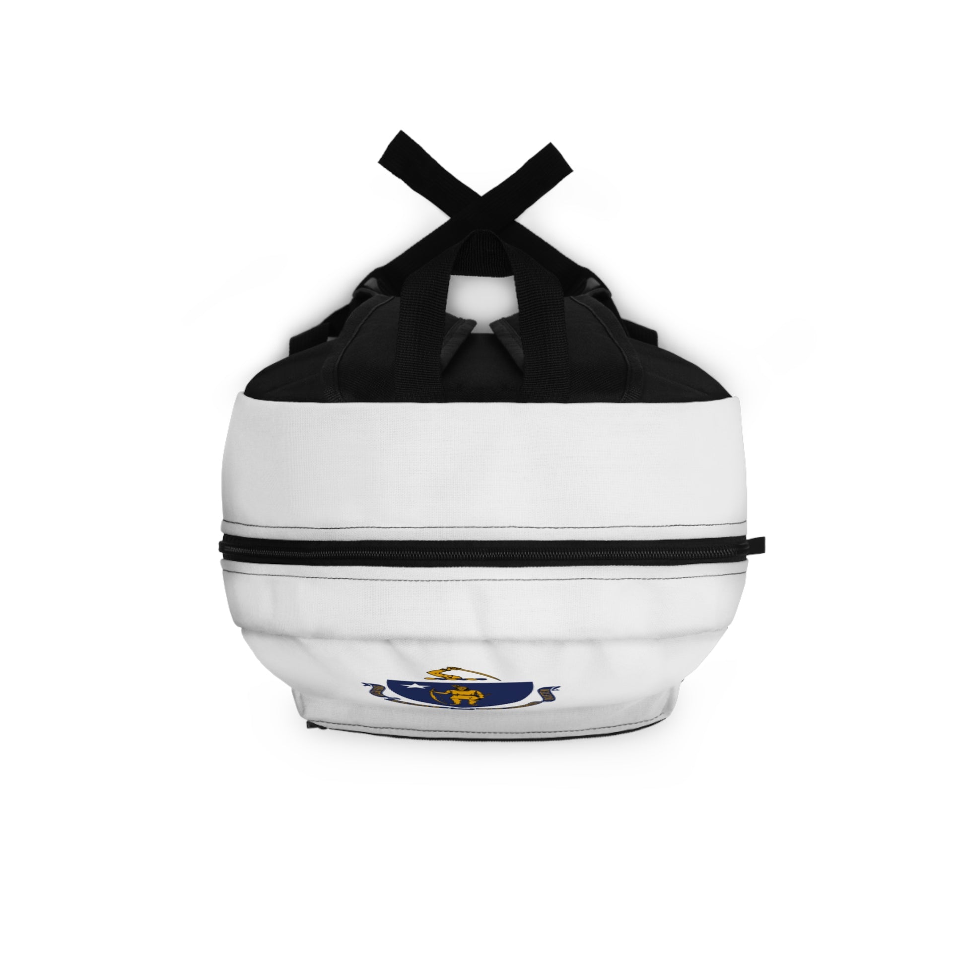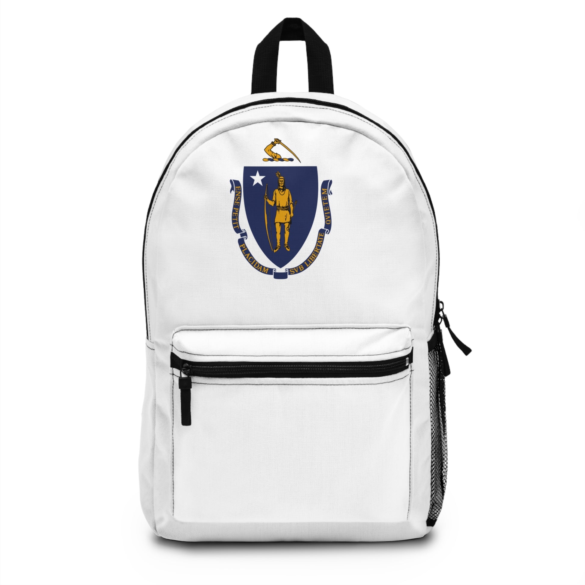 Show your Bay State pride with the Massachusetts Backpack, inspired by the classic flag of Massachusetts. This design showcases the state’s elegant blue shield bearing a Native American holding a bow and arrow, with a shining gold star symbolizing Massachusetts as one of the original thirteen colonies. Above the shield, a bent arm brandishing a sword serves as a reminder of the state’s readiness to defend liberty and justice — reflecting Massachusetts’ deep historical and revolutionary roots.