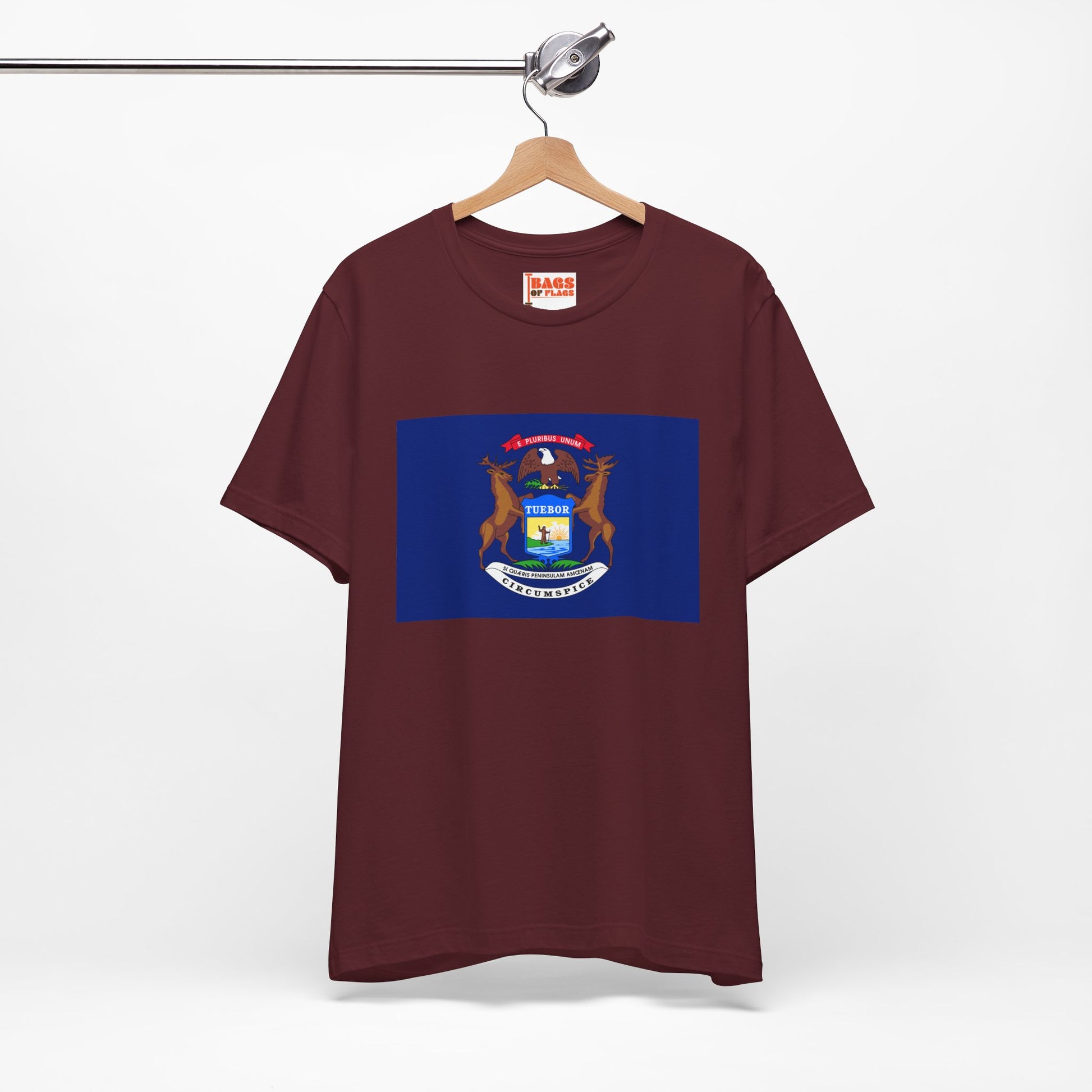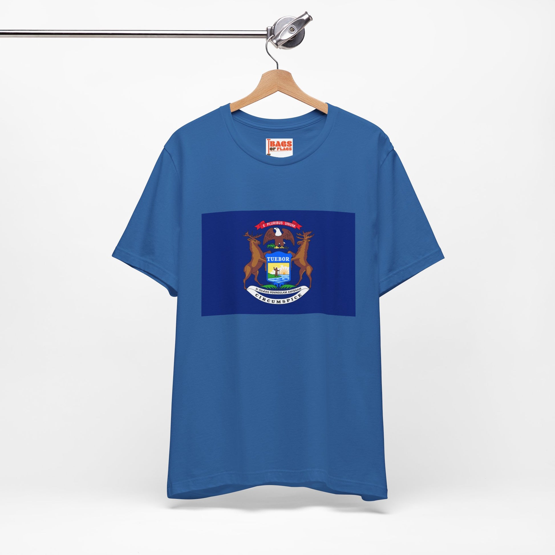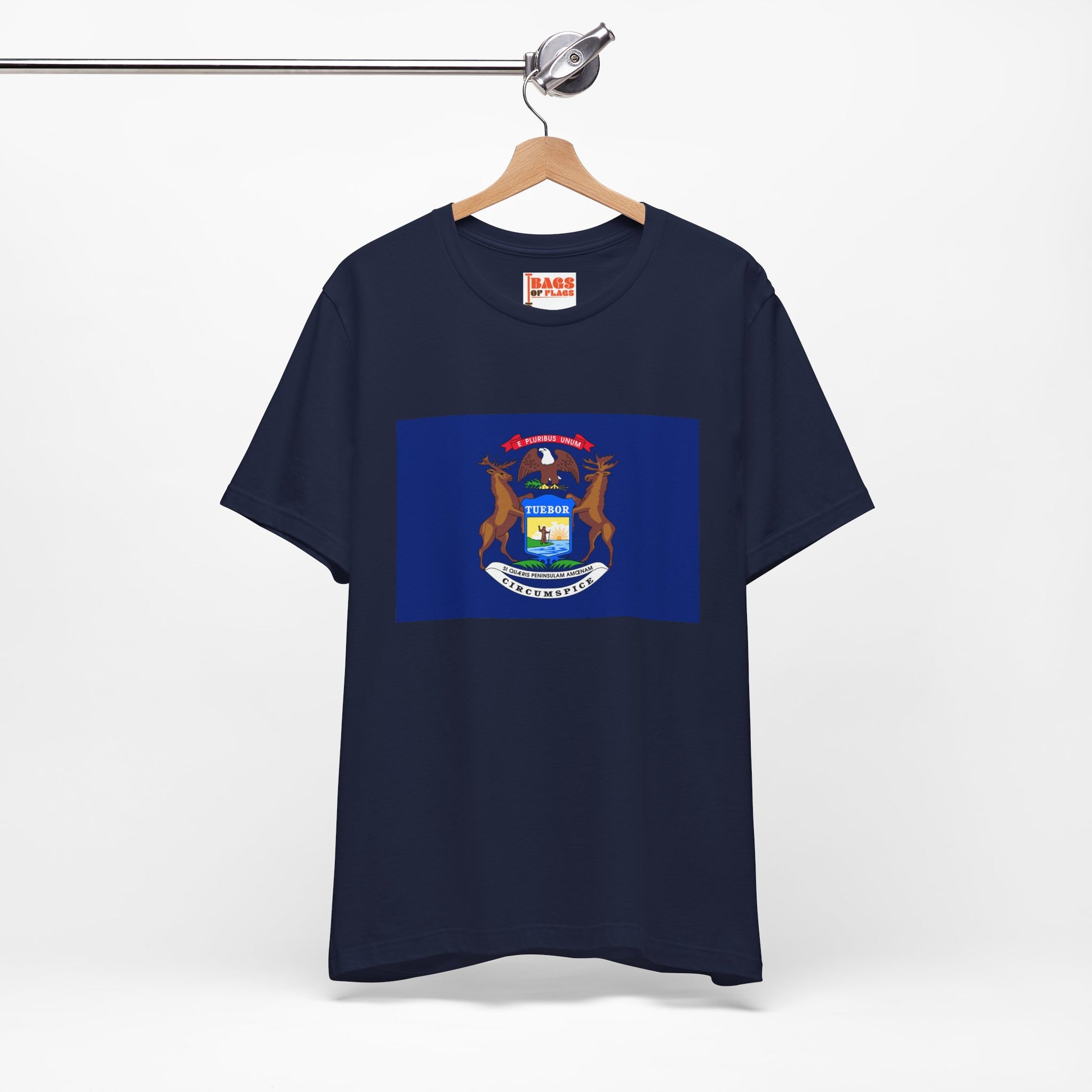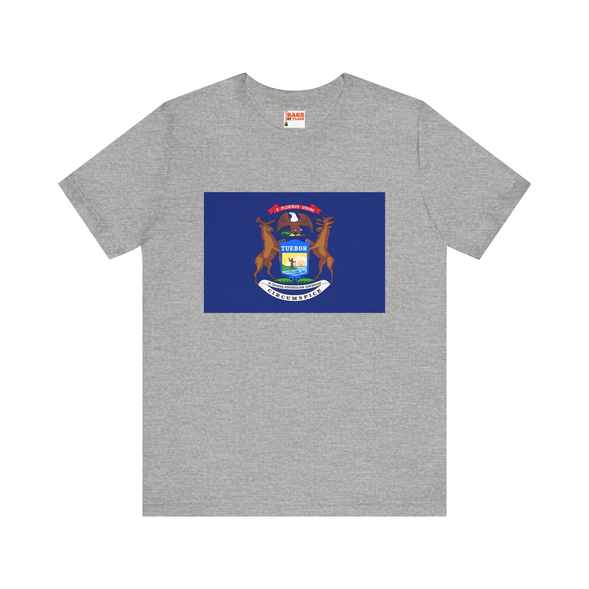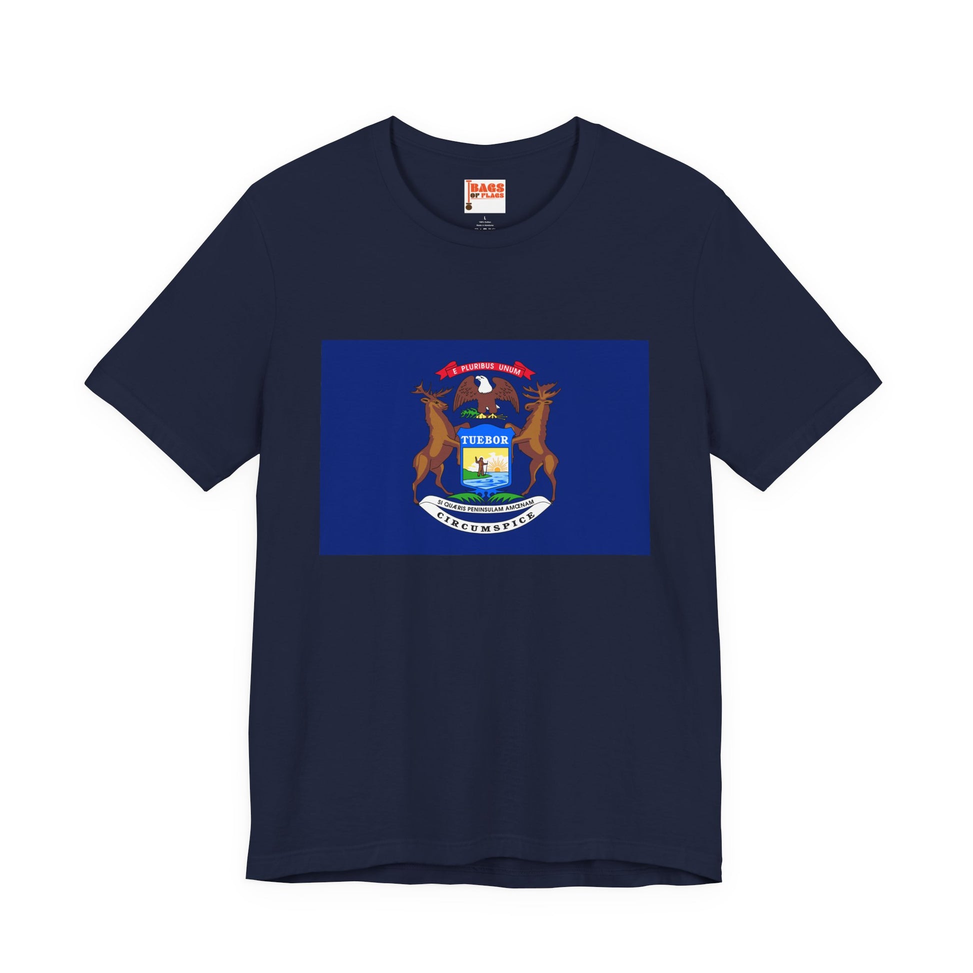 The Michigan state flag proudly displays a shield supported by an elk and moose, symbolizing strength and endurance. The bald eagle perched above represents the United States, while the Latin mottos emphasize defense and peace. Wearing this tee connects you to Michigan’s rich heritage and natural beauty.