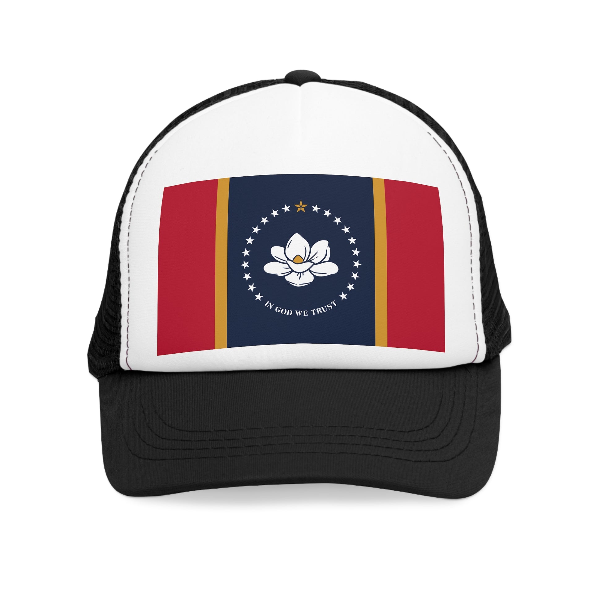 The Mississippi design reflects a state known for its rich cultural legacy, deep musical roots, and strong sense of tradition. Mississippi symbolism often honors its river heritage, agricultural strength, and the warm hospitality that defines the South. With references to its flowing waterways, fertile landscapes, and resilient communities, this cap represents Mississippi's enduring pride and heartfelt spirit — a tribute to the rhythms, history, and identity of the Magnolia State.