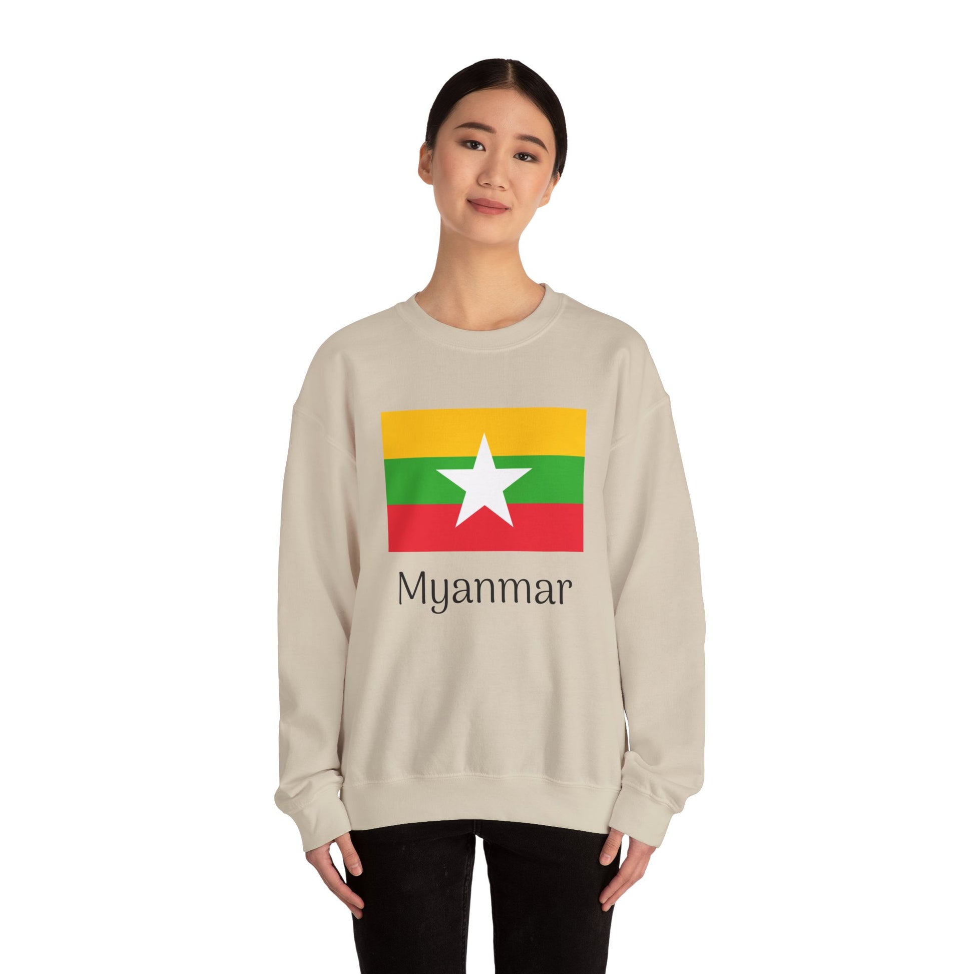 The Myanmar flag features three horizontal stripes of yellow, green, and red with a white five-pointed star at the center. Yellow represents solidarity, green symbolizes peace, tranquility, and the country’s natural wealth, and red reflects courage and decisiveness. The white star stands for the union of Myanmar and the equality of its people. Wearing the Myanmar Sweatshirt celebrates the nation’s unity, values, and cultural pride.