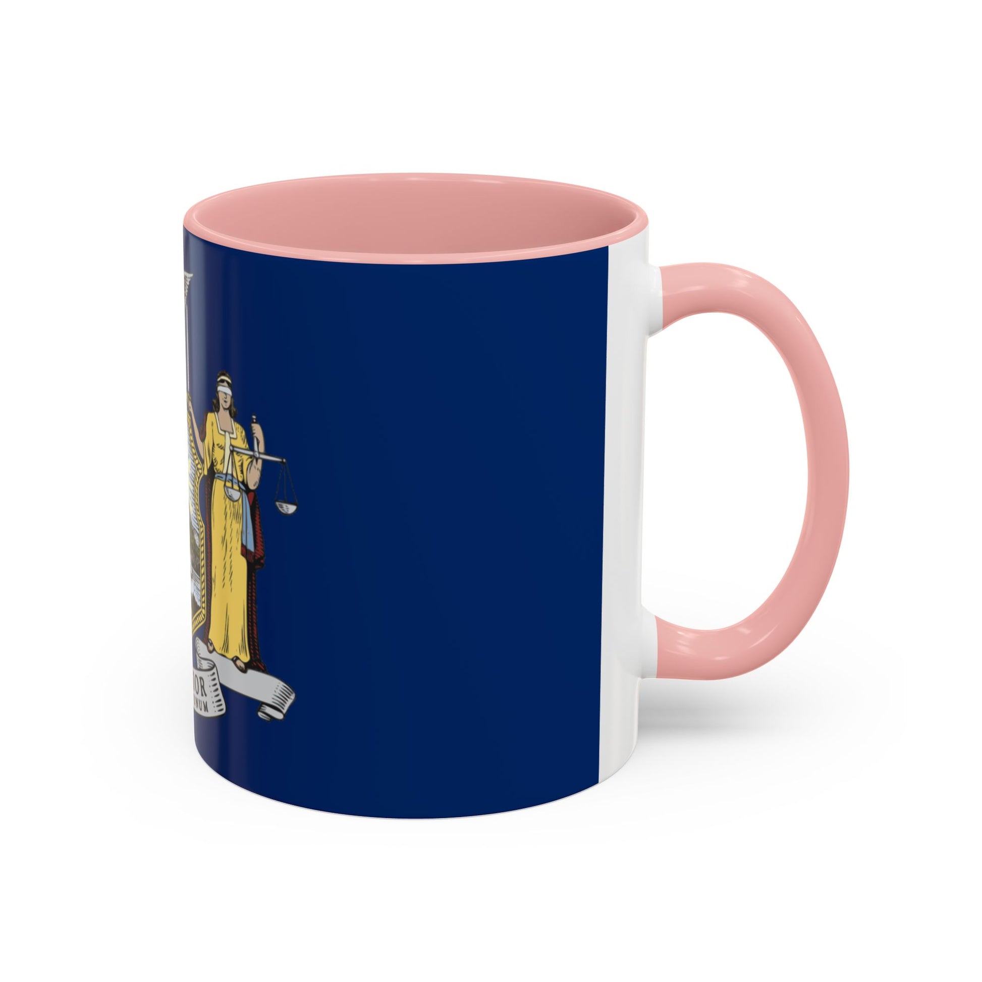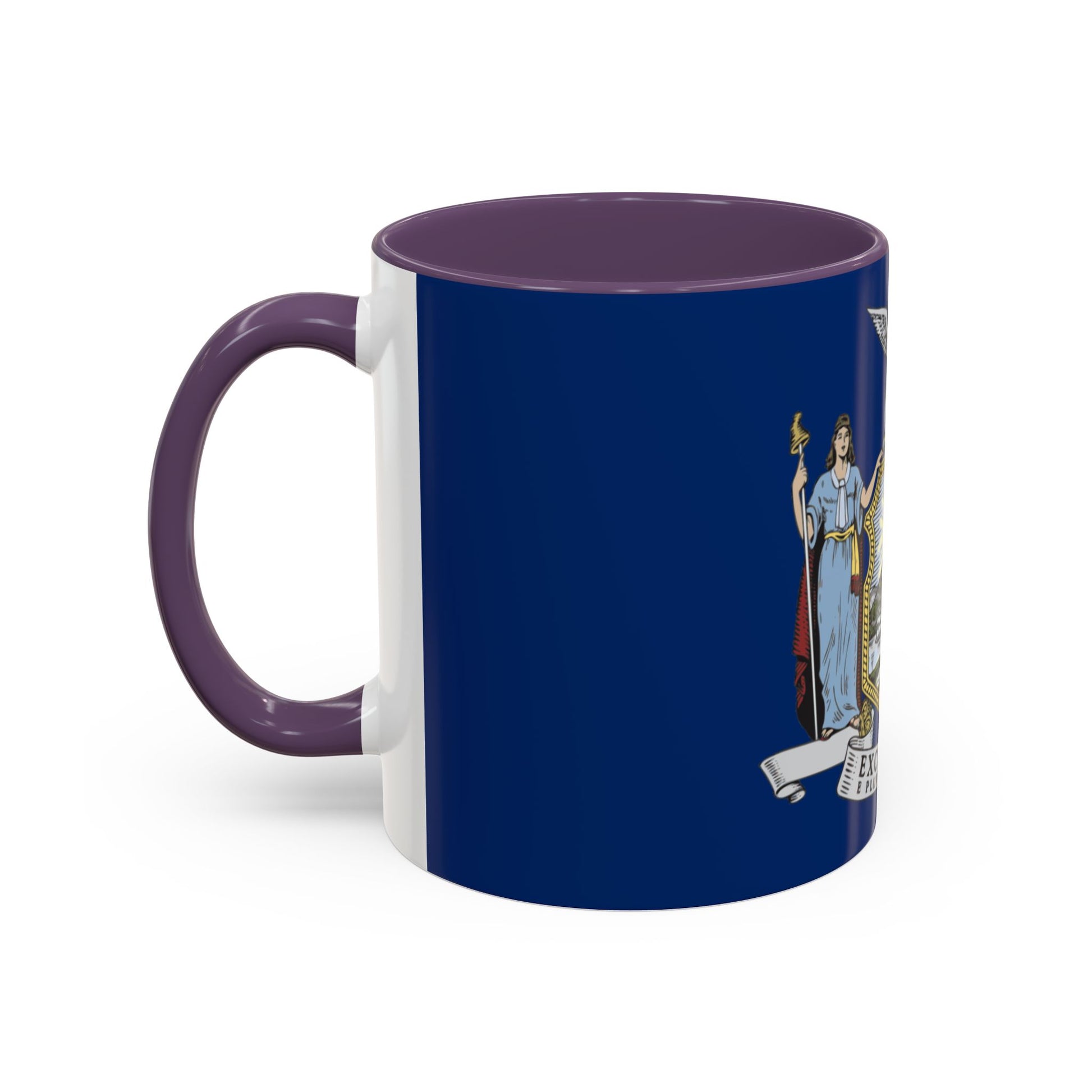 Start your day with Empire State pride using the New York Mug. This ceramic mug features the New York state flag, displaying the state coat of arms on a deep blue background. The design includes Liberty and Justice standing on either side of a shield, with a rising sun over mountains and water, a symbol of hope and opportunity. At the top, an eagle rests on a globe, representing strength and vigilance. The state motto, “Excelsior” (“Ever Upward”), inspires progress and ambition with every sip.