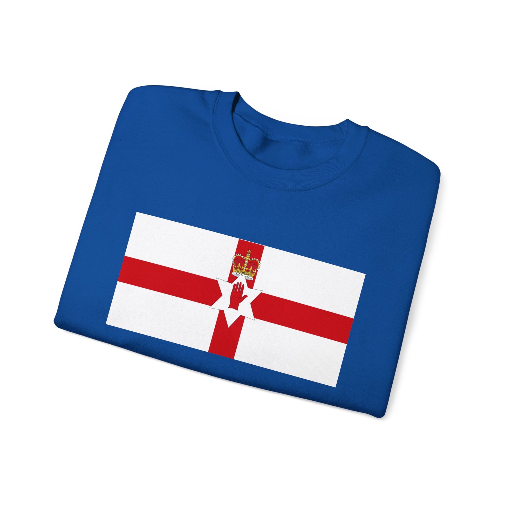 The flag of Northern Ireland (Ulster Banner) features a red cross on a white field, a six-pointed star, a red hand at the center, and a crown above. The red cross represents St. George, the patron saint of Northern Ireland. The red hand symbolizes the province of Ulster, while the six-pointed star represents Northern Ireland’s six counties. The crown signifies loyalty to the United Kingdom. Wearing the Northern Ireland Flag Sweatshirt is a proud way to celebrate the region’s history, identity, and heritage.