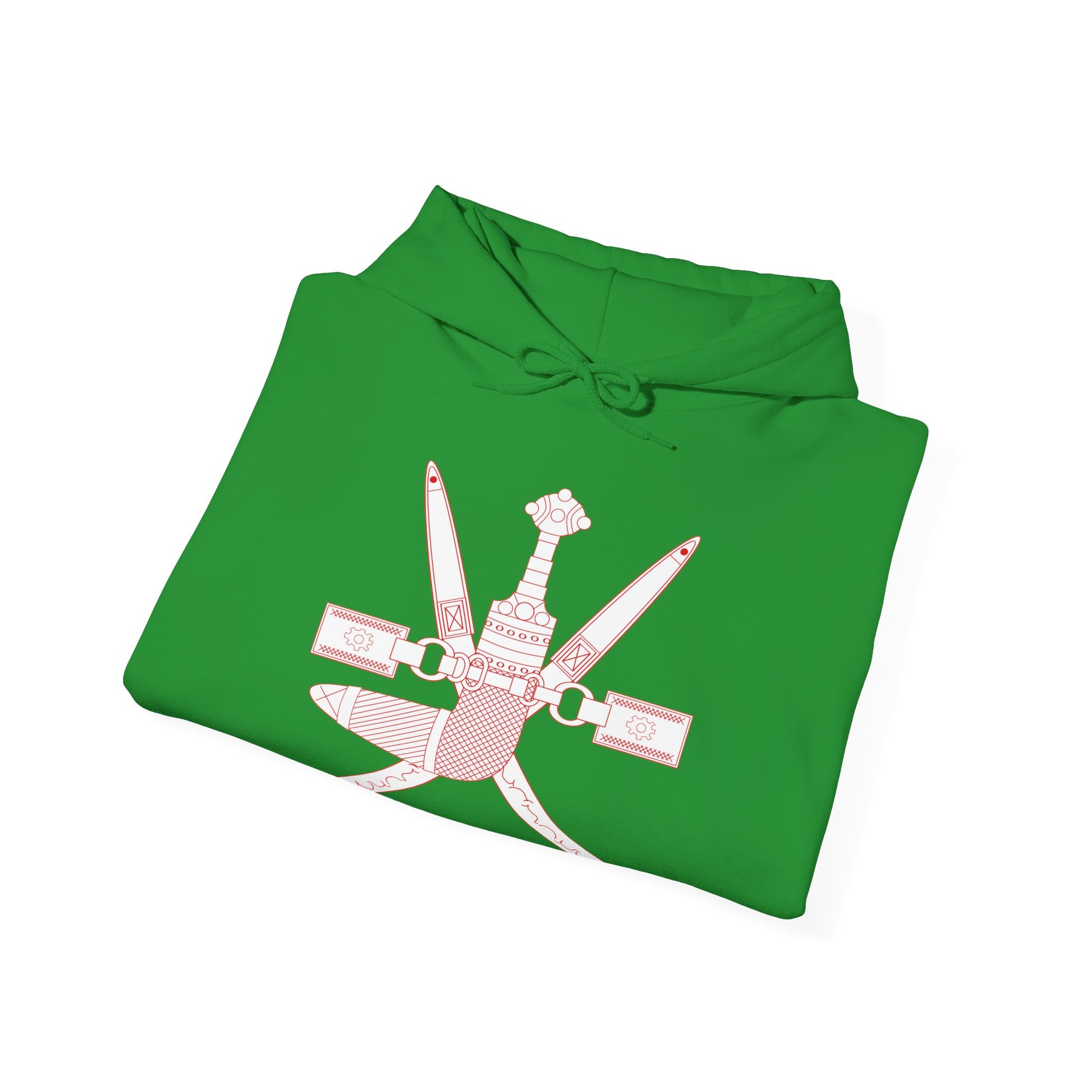 Celebrate Omani heritage with the Oman Symbol Hoodies (Khanjar wa Saifain), featuring the iconic national emblem of Oman: the traditional khanjar (dagger) crossed with two swords. This design represents courage, strength, and the pride of Oman, making it perfect for Omanis, admirers of Omani culture, or anyone who appreciates meaningful, emblem-inspired apparel.