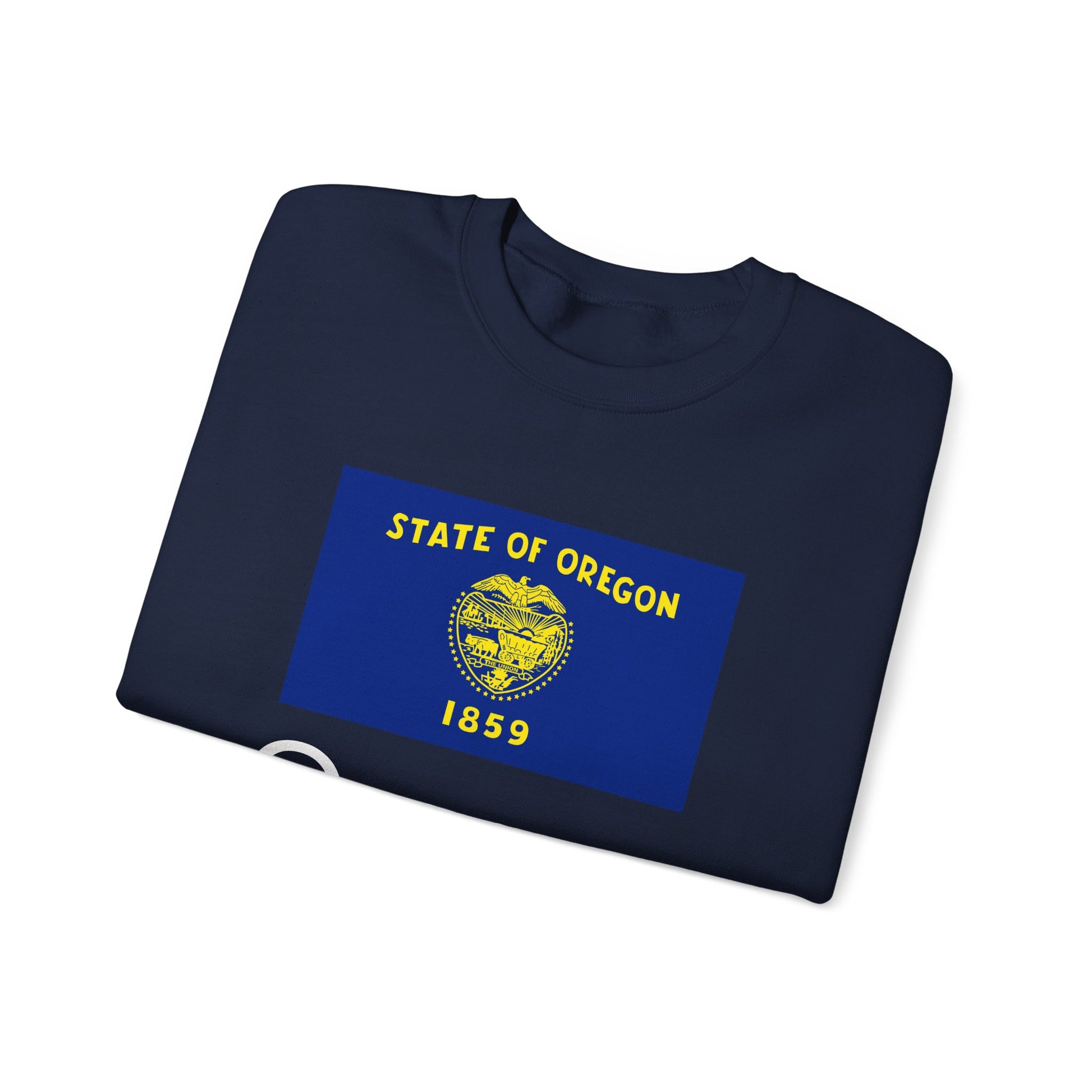 The design is inspired by the Oregon state flag, which features a navy blue field with a gold shield and 33 stars, symbolizing Oregon as the 33rd state admitted to the Union. The shield depicts a covered wagon crossing the plains, reflecting the pioneer spirit and westward expansion. An American eagle spreads its wings above the shield, representing national pride, and the banner reads “State of Oregon 1859”. The reverse side features a beaver, honoring Oregon’s state animal and historic fur trade. This sweatshirt celebrates Oregon’s heritage, pioneering spirit, and natural beauty.