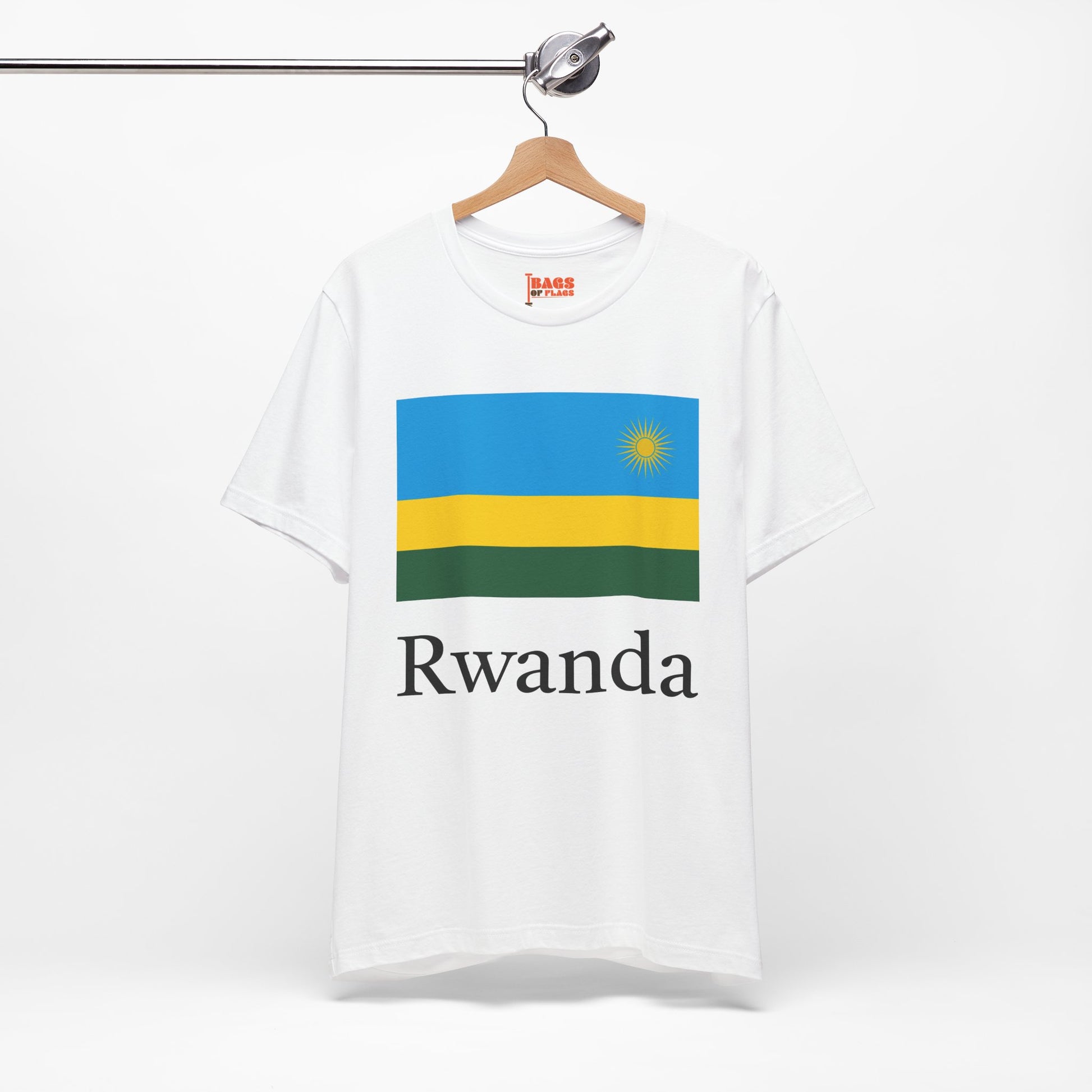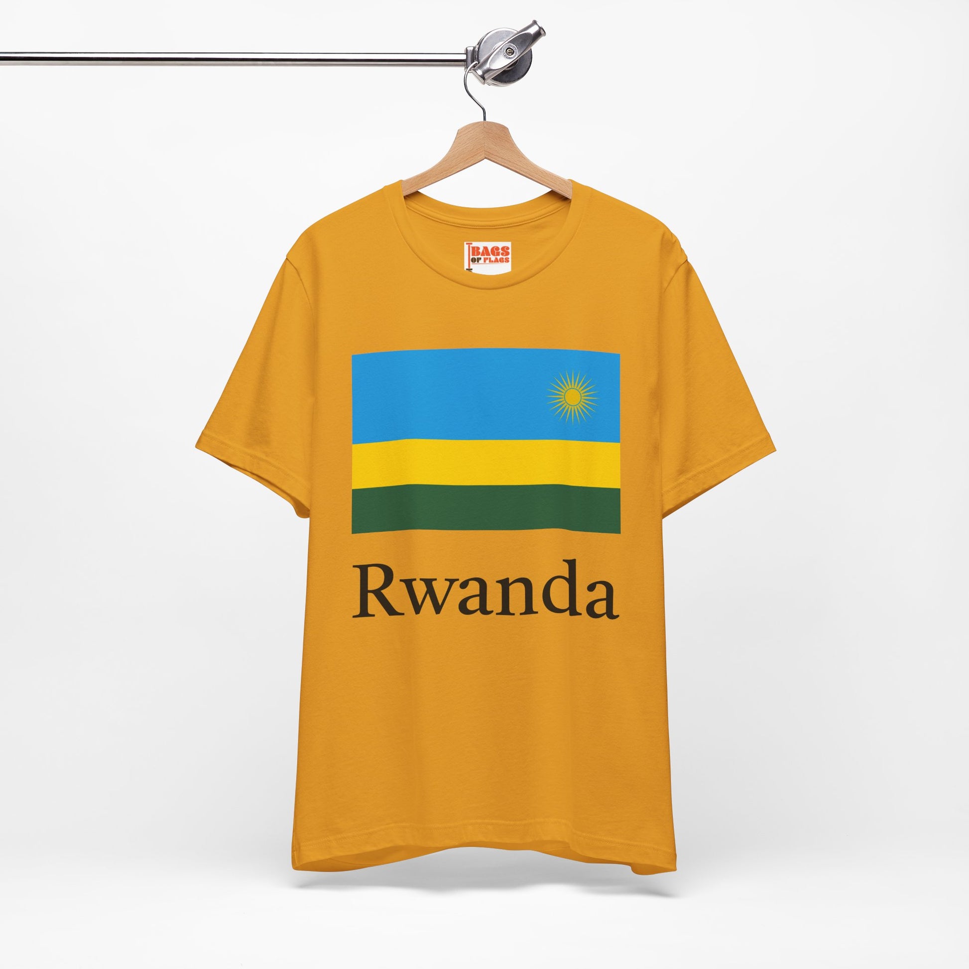 Celebrate the vibrant spirit of Rwanda with this thoughtfully designed Rwanda T-shirt, featuring the bold colors and symbolic elements of the national flag. From the brilliant sun symbolizing enlightenment to the harmonious blue, yellow, and green bands representing peace, development, and prosperity, this shirt is a wearable tribute to the nation's optimism and strength.