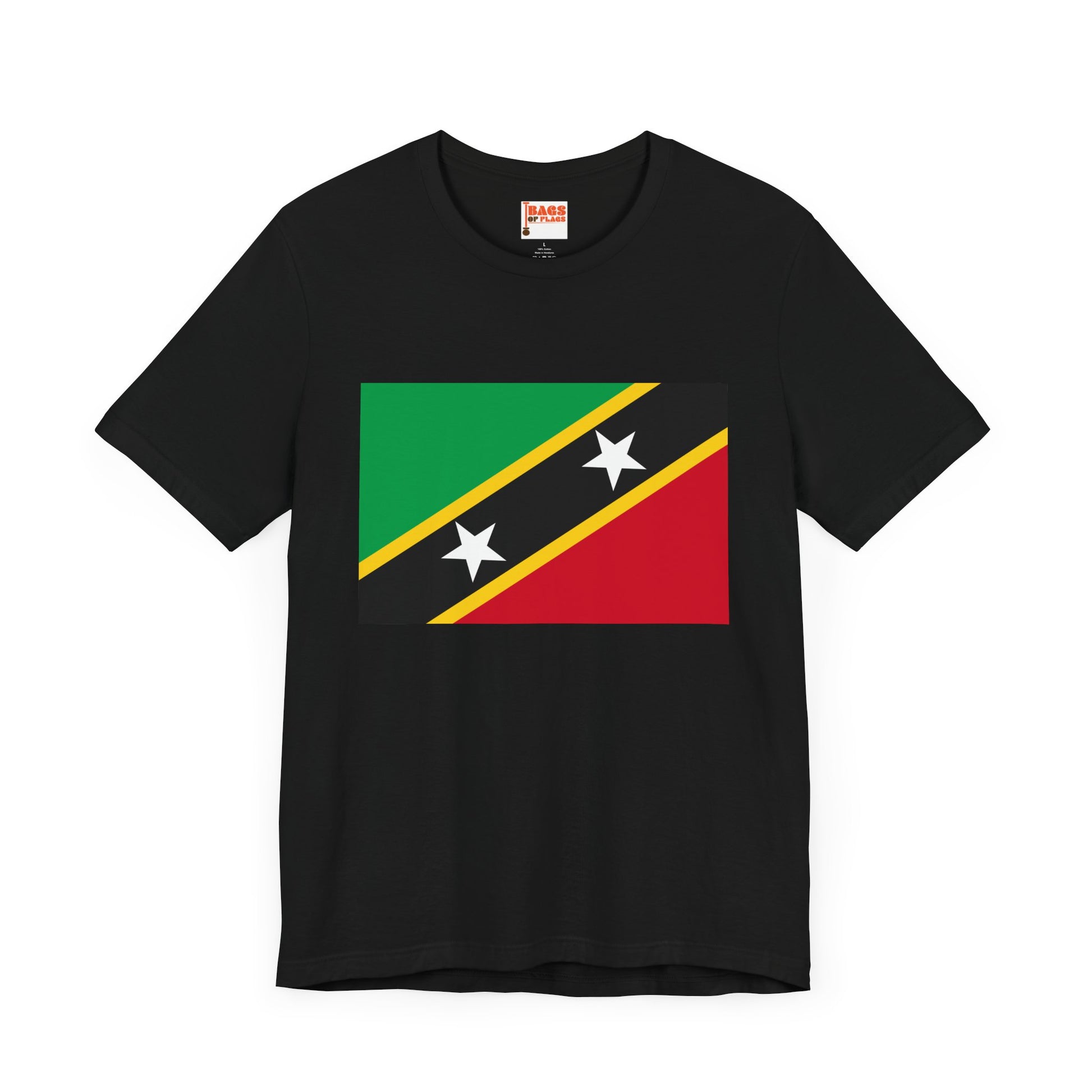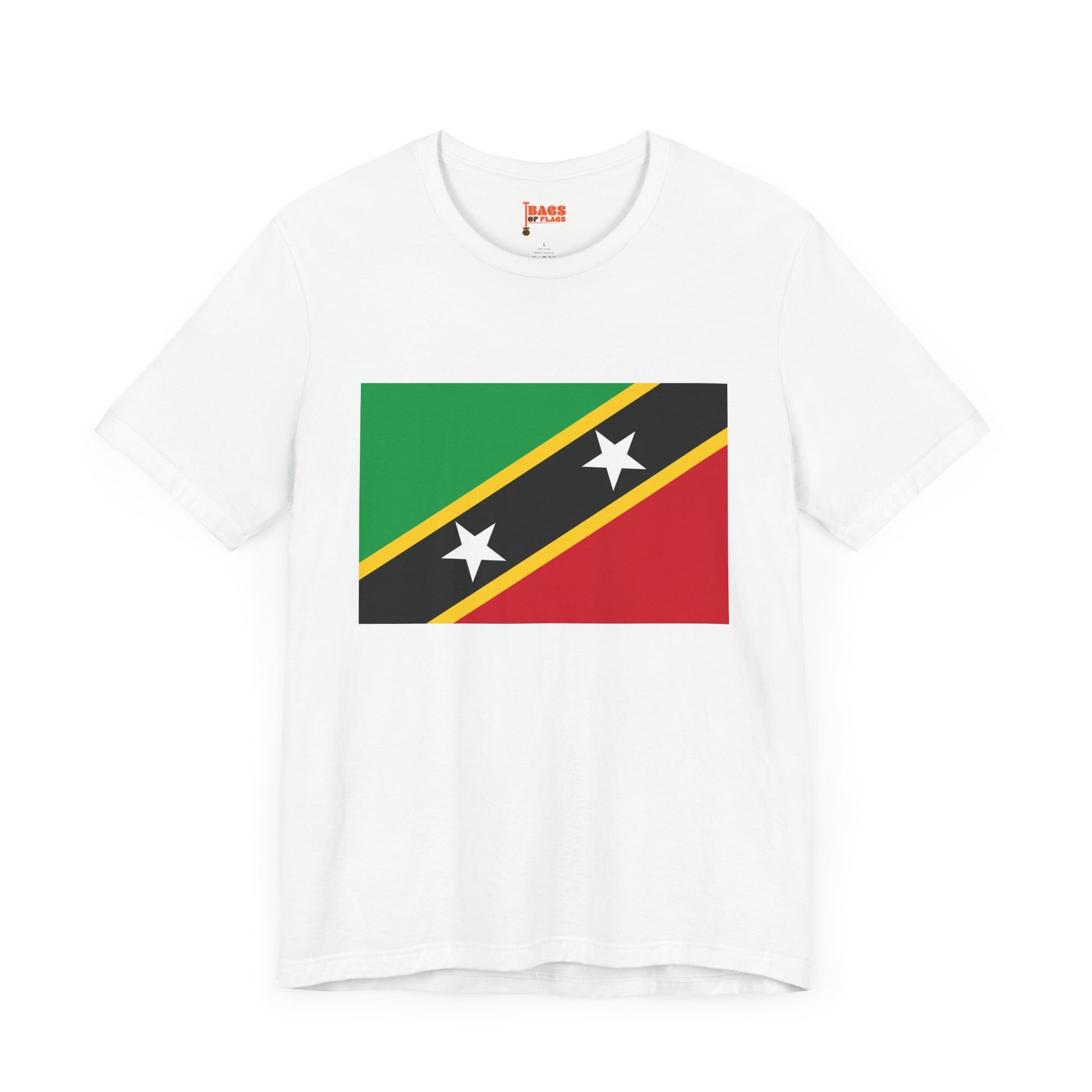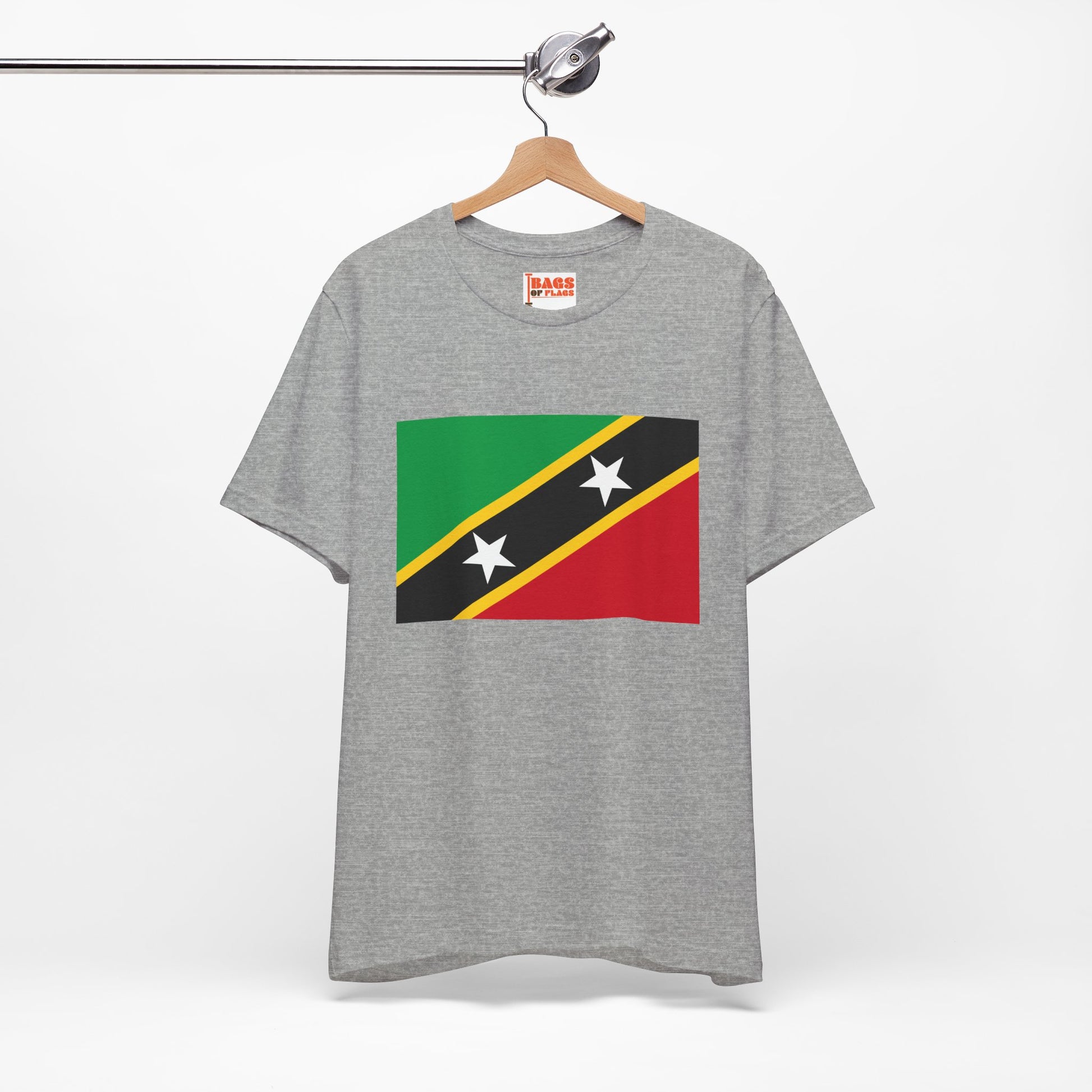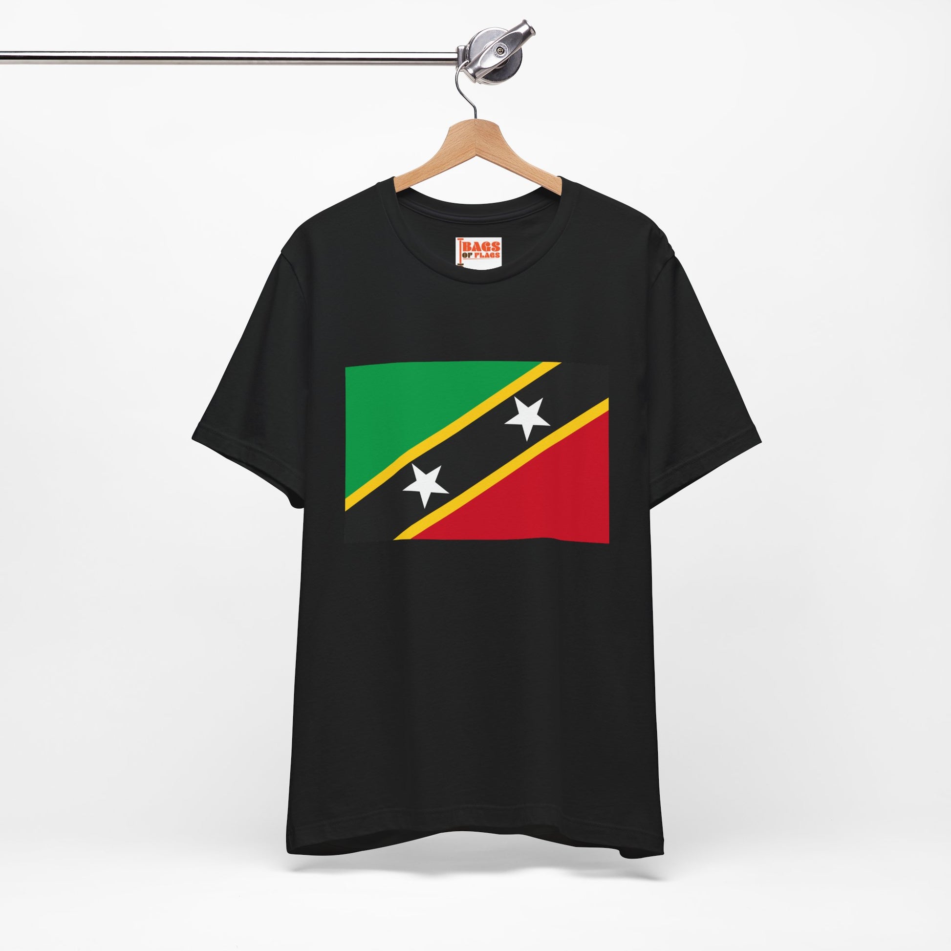 Celebrate the vibrant culture of the Caribbean with this Saint Kitts and Nevis Flag T-shirt. Featuring the striking diagonal design of the national flag—green for fertile land, red for resilience, yellow for sunshine, and two bold white stars on black symbolizing hope and liberty—this shirt is a vivid expression of national pride and island identity.