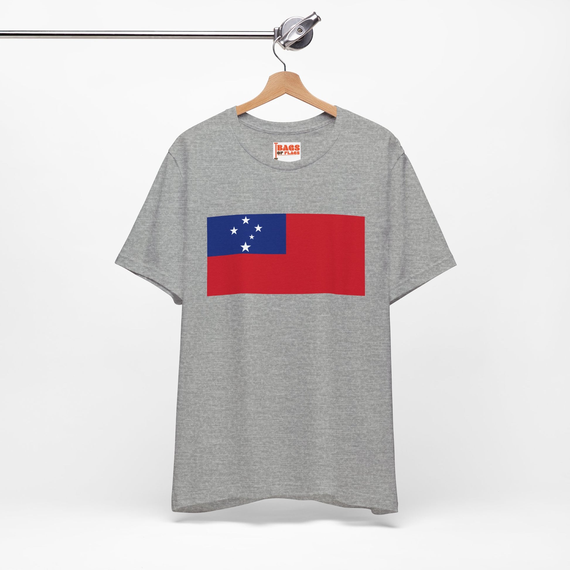 - Design: Samoa flag graphic with red field, blue canton, and white constellation