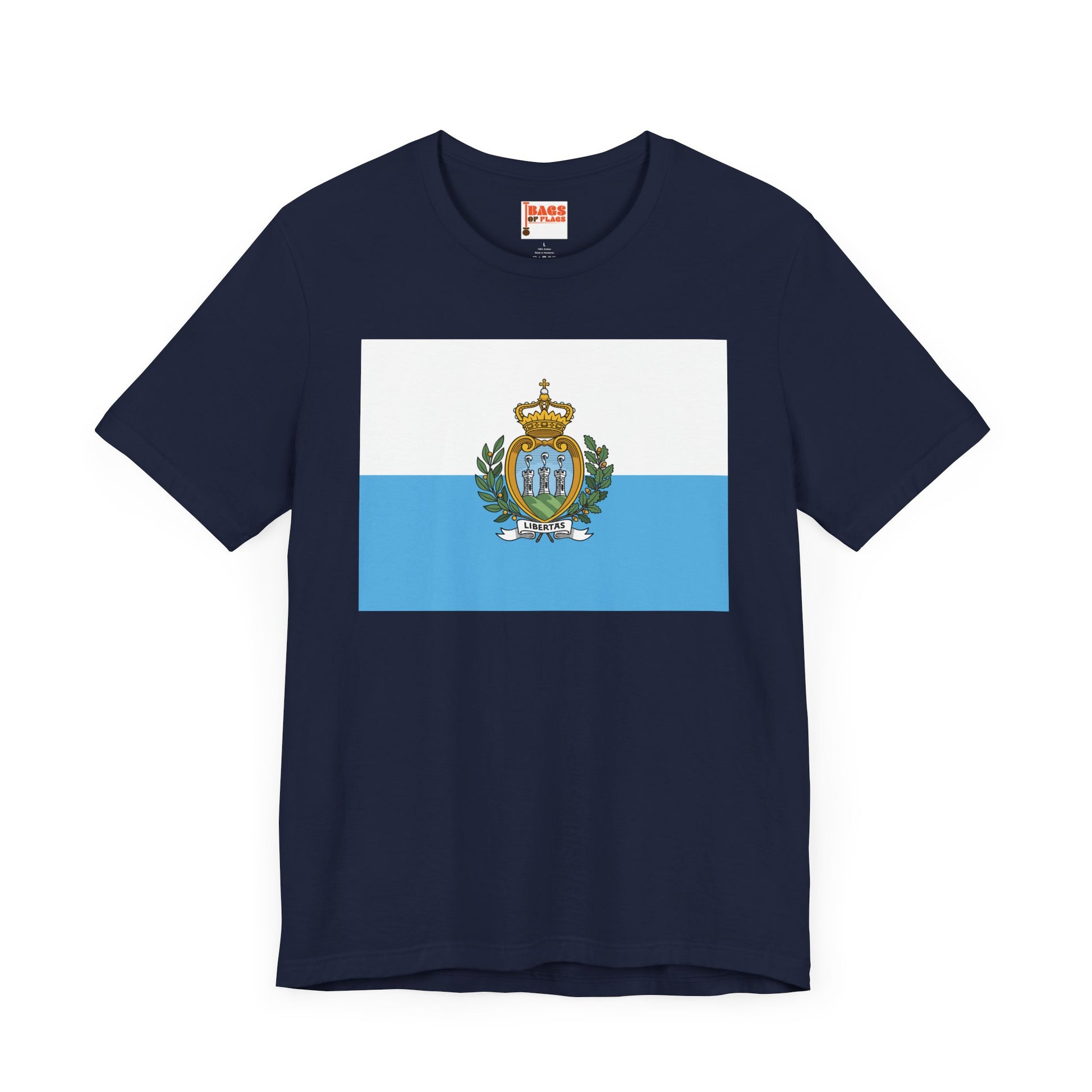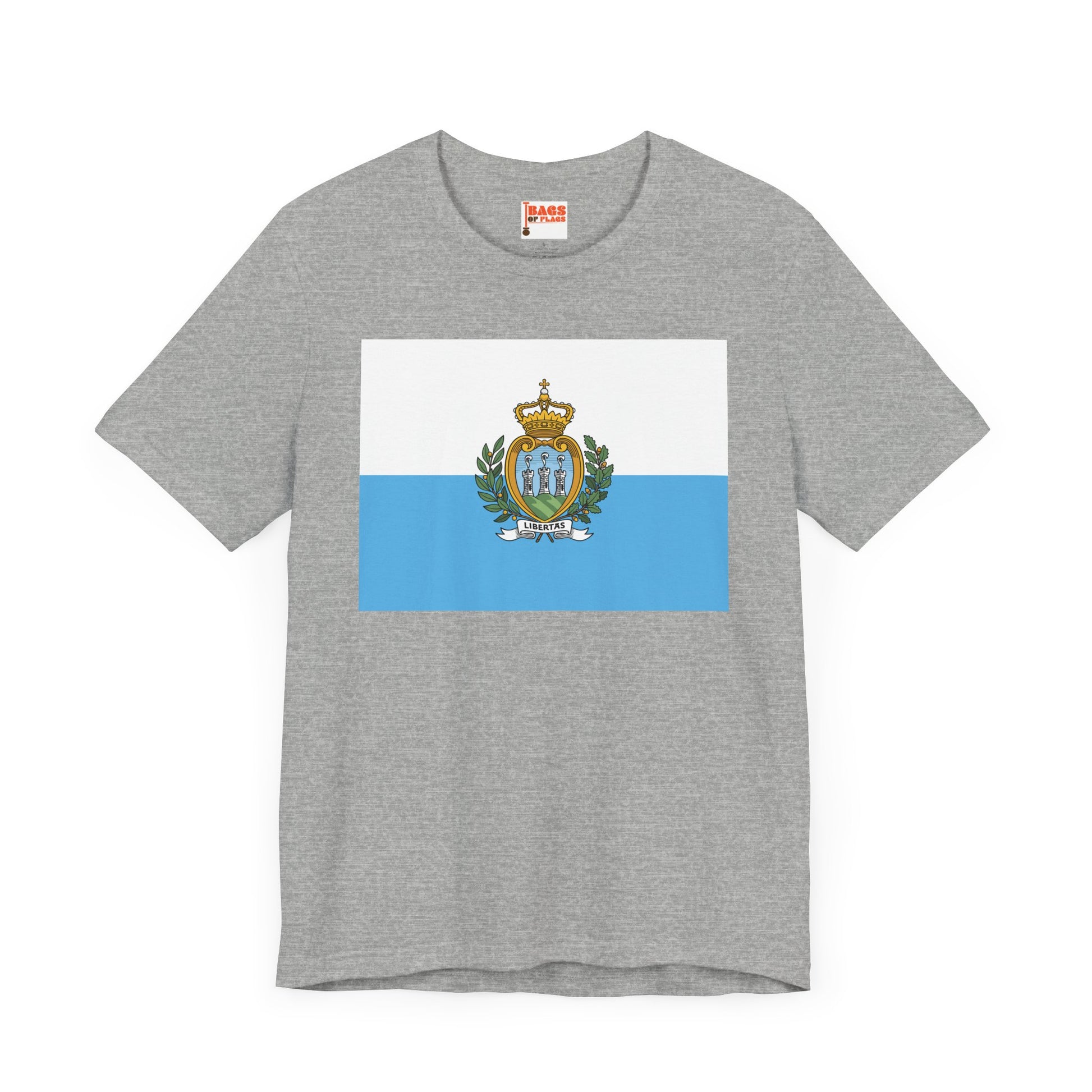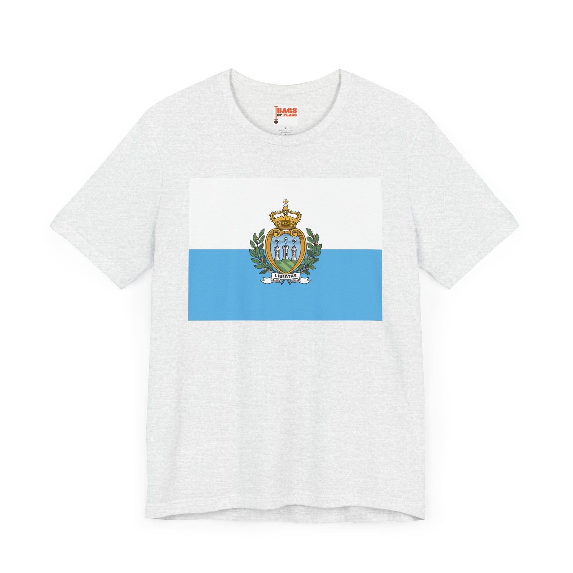 Embrace the spirit of the world’s oldest republic with this San Marino Flag T-shirt. Showcasing the serene white and light blue fields with the intricate national coat of arms, this design symbolizes liberty, strength, and tradition. Whether you're a Sammarinese native, traveler, or admirer of its rich history, this shirt lets you wear the identity of San Marino with subtle sophistication.