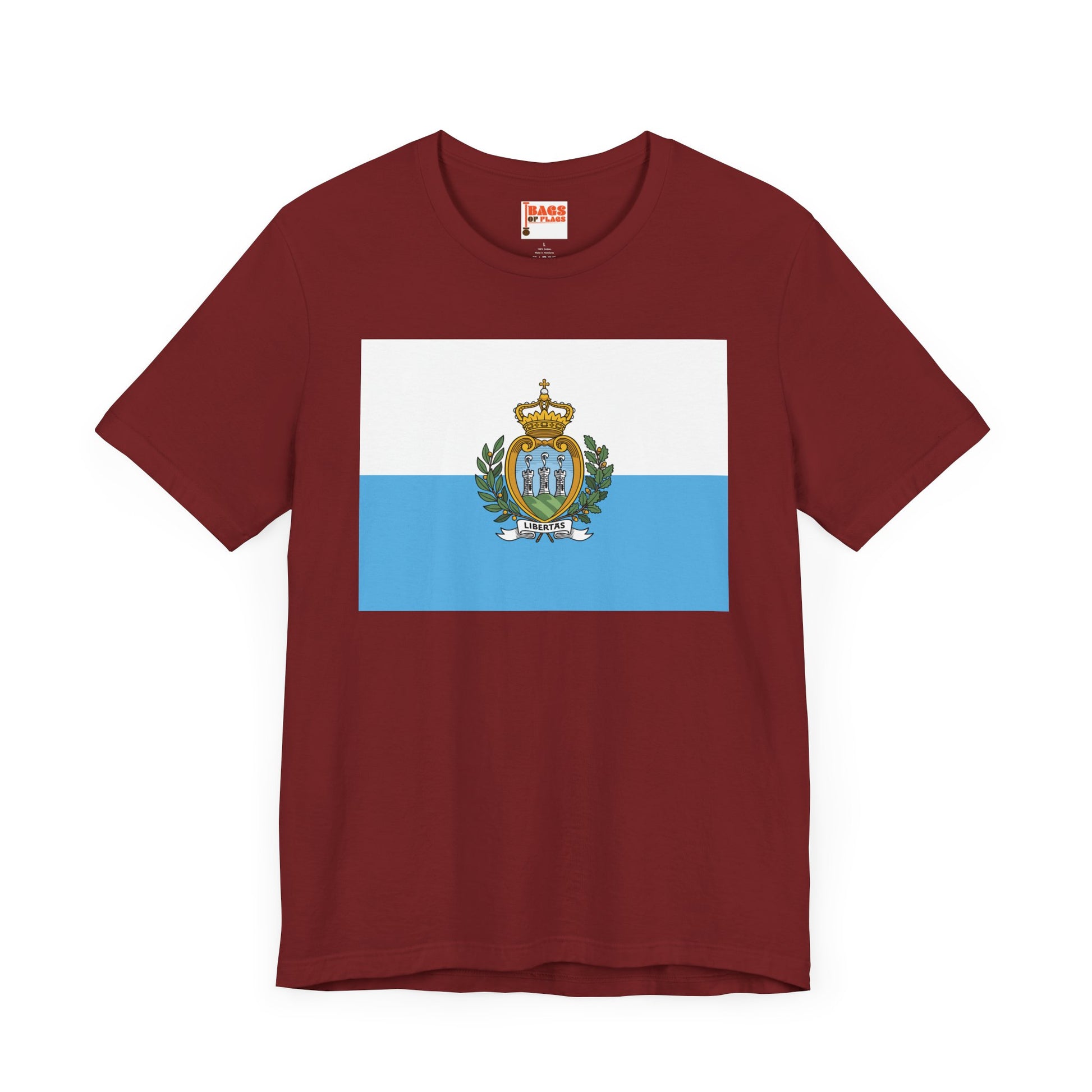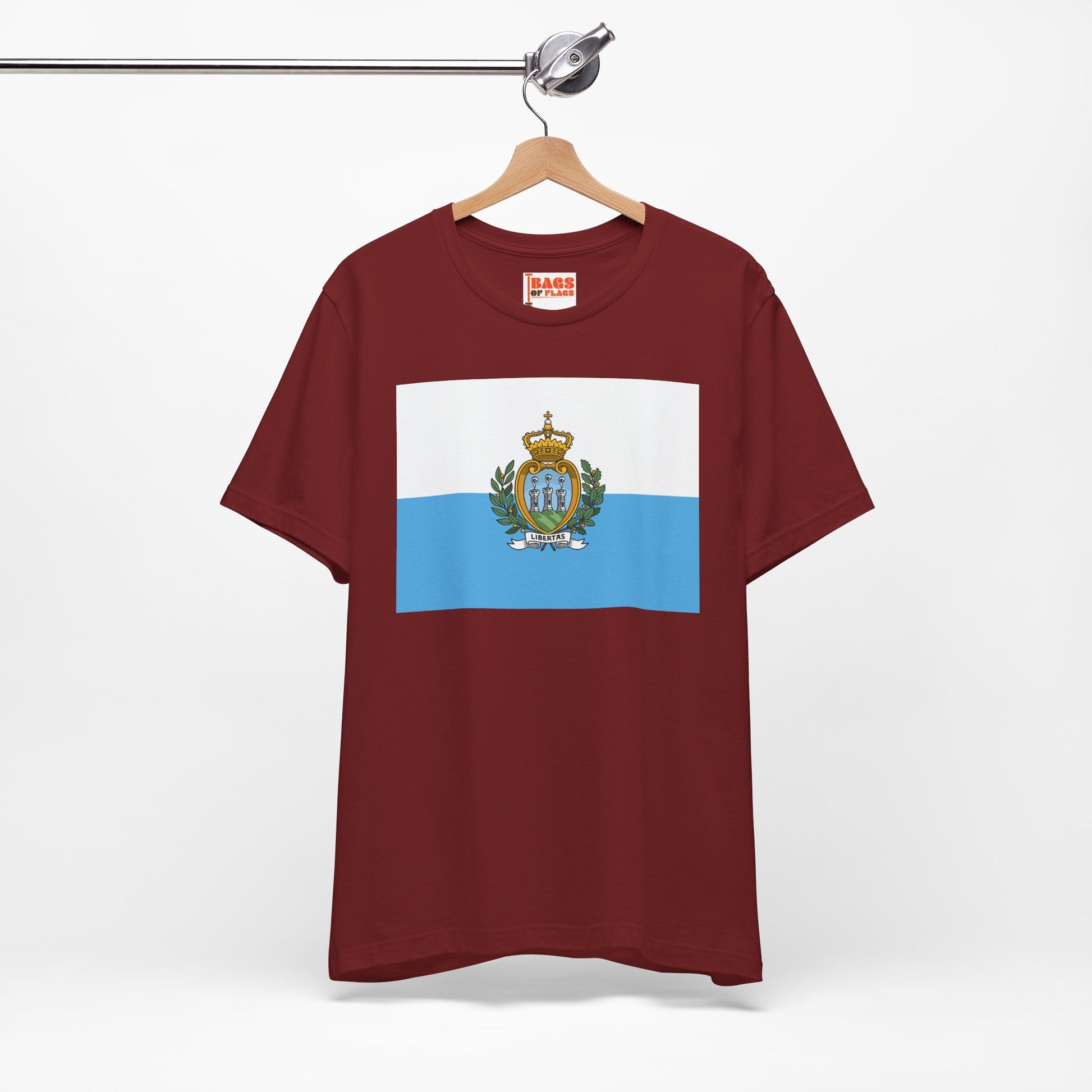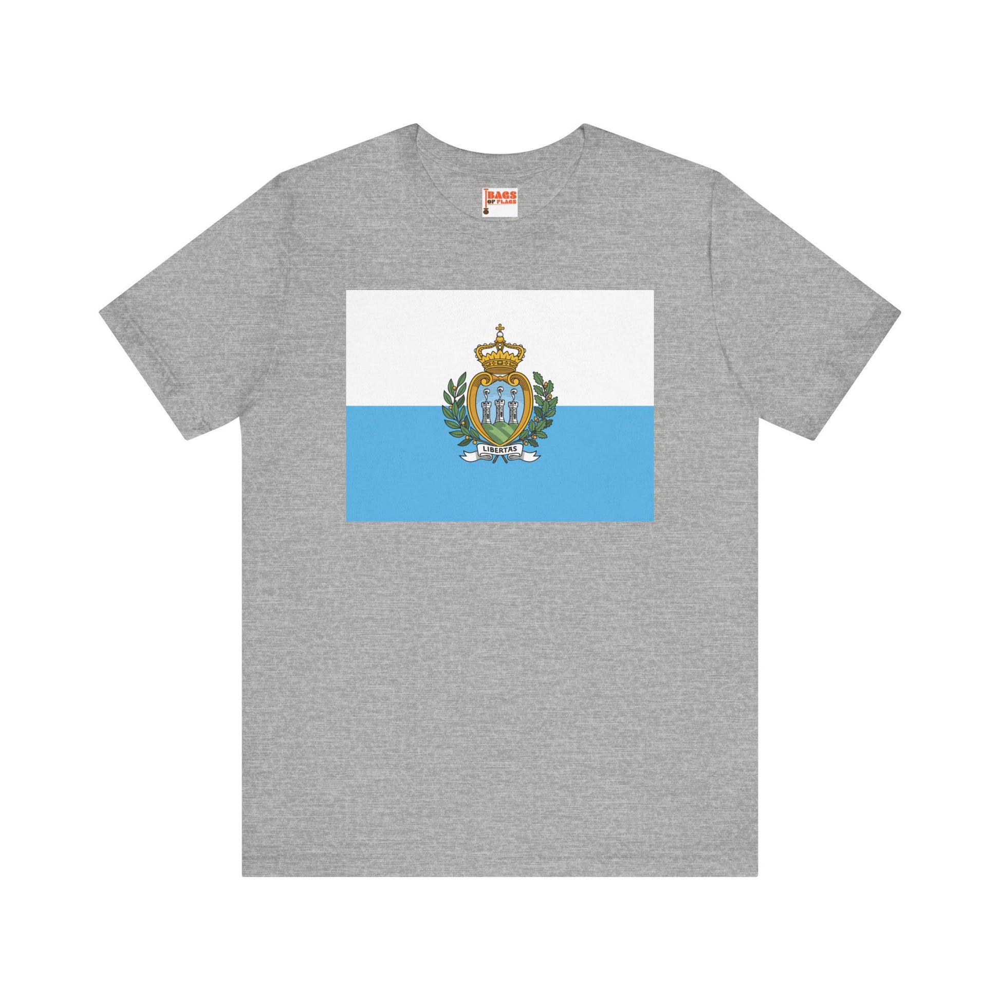 Embrace the spirit of the world’s oldest republic with this San Marino Flag T-shirt. Showcasing the serene white and light blue fields with the intricate national coat of arms, this design symbolizes liberty, strength, and tradition. Whether you're a Sammarinese native, traveler, or admirer of its rich history, this shirt lets you wear the identity of San Marino with subtle sophistication.