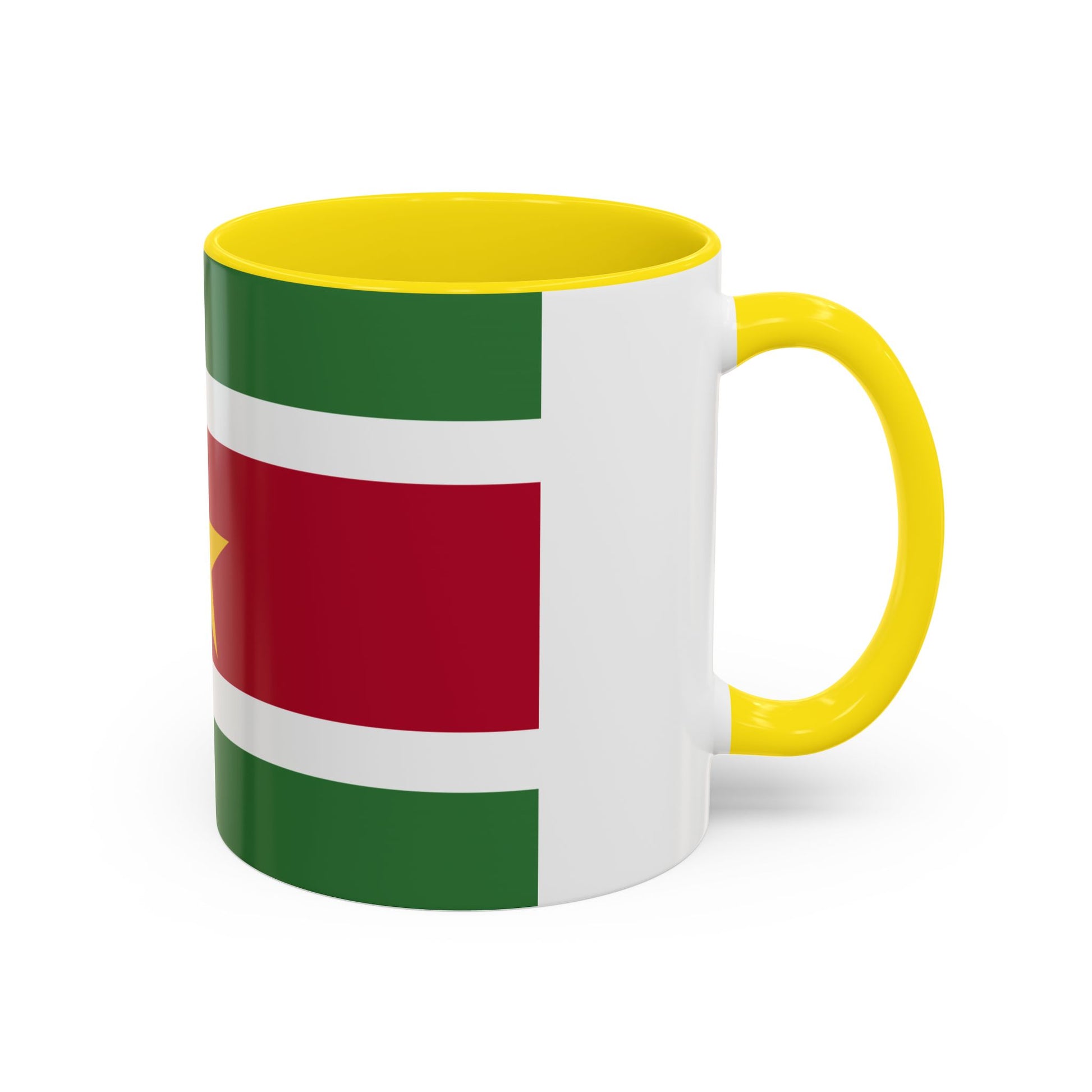 The green stripes represent hope and fertility, the white stripes symbolize freedom and justice, and the red stripe stands for progress and love. The golden star at the center represents unity among the diverse peoples of Suriname. Every element of this mug reflects the nation’s vibrant spirit and harmonious multicultural identity.