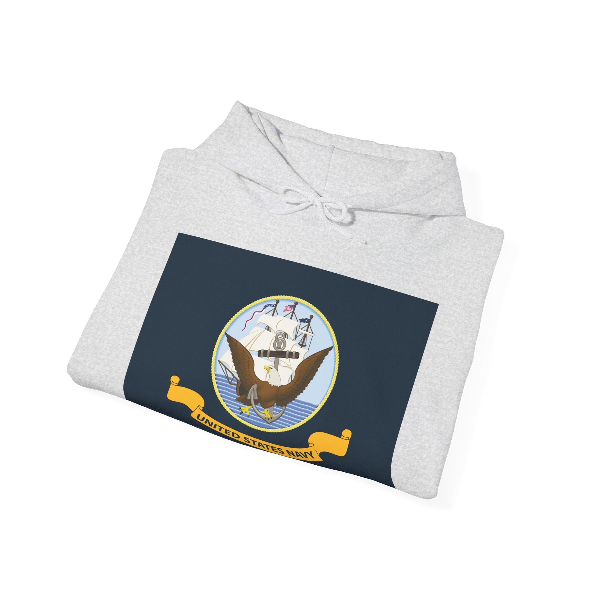 The US Navy Hoodie prominently displays the U.S. Navy flag, which features a dark blue field with the official Navy seal in the center. The seal includes an eagle, a ship, and a fouled anchor, symbolizing naval strength, readiness, and global reach. The colors of the flag—blue, gold, and white—represent loyalty, honor, and excellence. Wearing this hoodie honors the commitment and sacrifices of Navy personnel while connecting you to the heritage and enduring values of America’s naval forces.