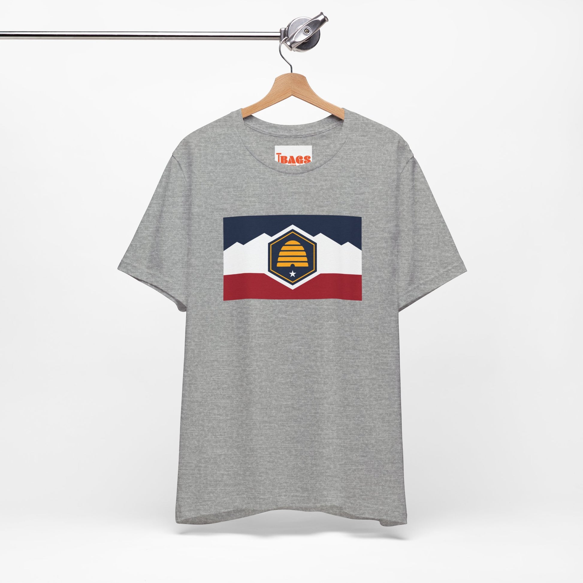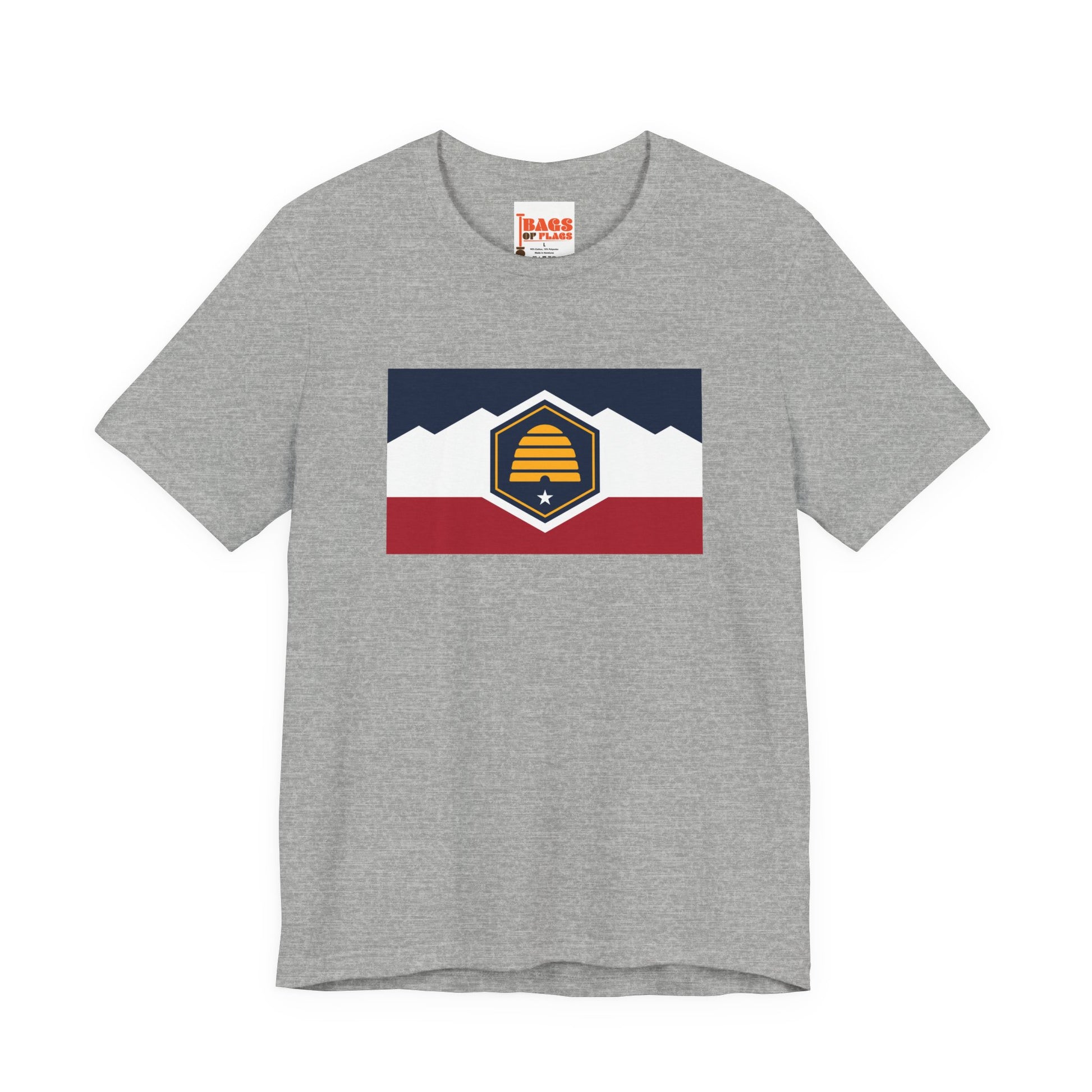 Wear your Utah pride front and center with this bold and comfortable Utah Flag T-shirt. Featuring a crisp, vibrant print of the official state flag of Utah, this tee pays homage to the state’s deep roots, natural beauty, and pioneering spirit. The emblem showcases a bald eagle, beehive, and U.S. flags—symbols of unity, industry, and patriotism that are close to the heart of every Utahn.
