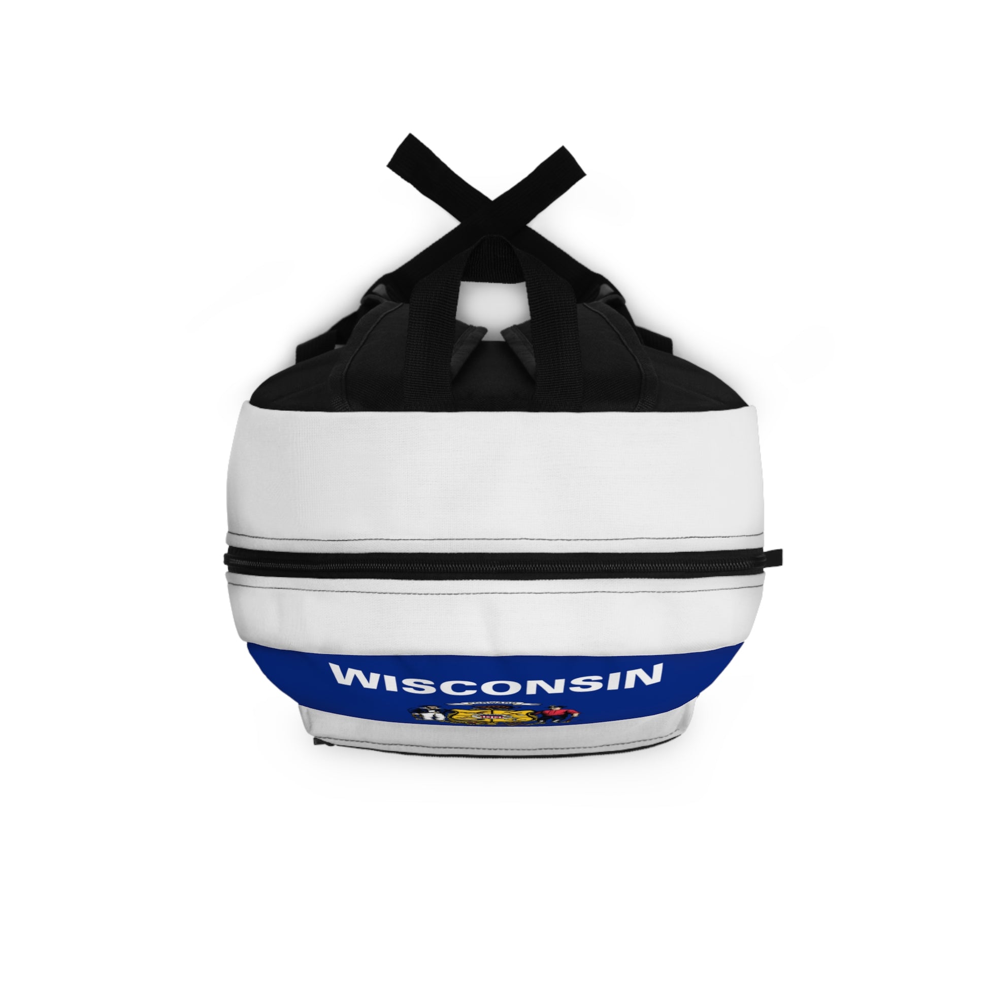 Carry the Badger State with you in style with the Wisconsin Backpack, featuring a design inspired by the Wisconsin state flag. The flag’s deep blue field highlights the state coat of arms, complete with a sailor and a miner symbolizing Wisconsin’s maritime and industrial heritage. At the center, the shield displays tools, a plow, and a pickaxe, reflecting the state’s hardworking spirit, while the badger above the shield stands for determination and resilience — a true emblem of Wisconsin pride.