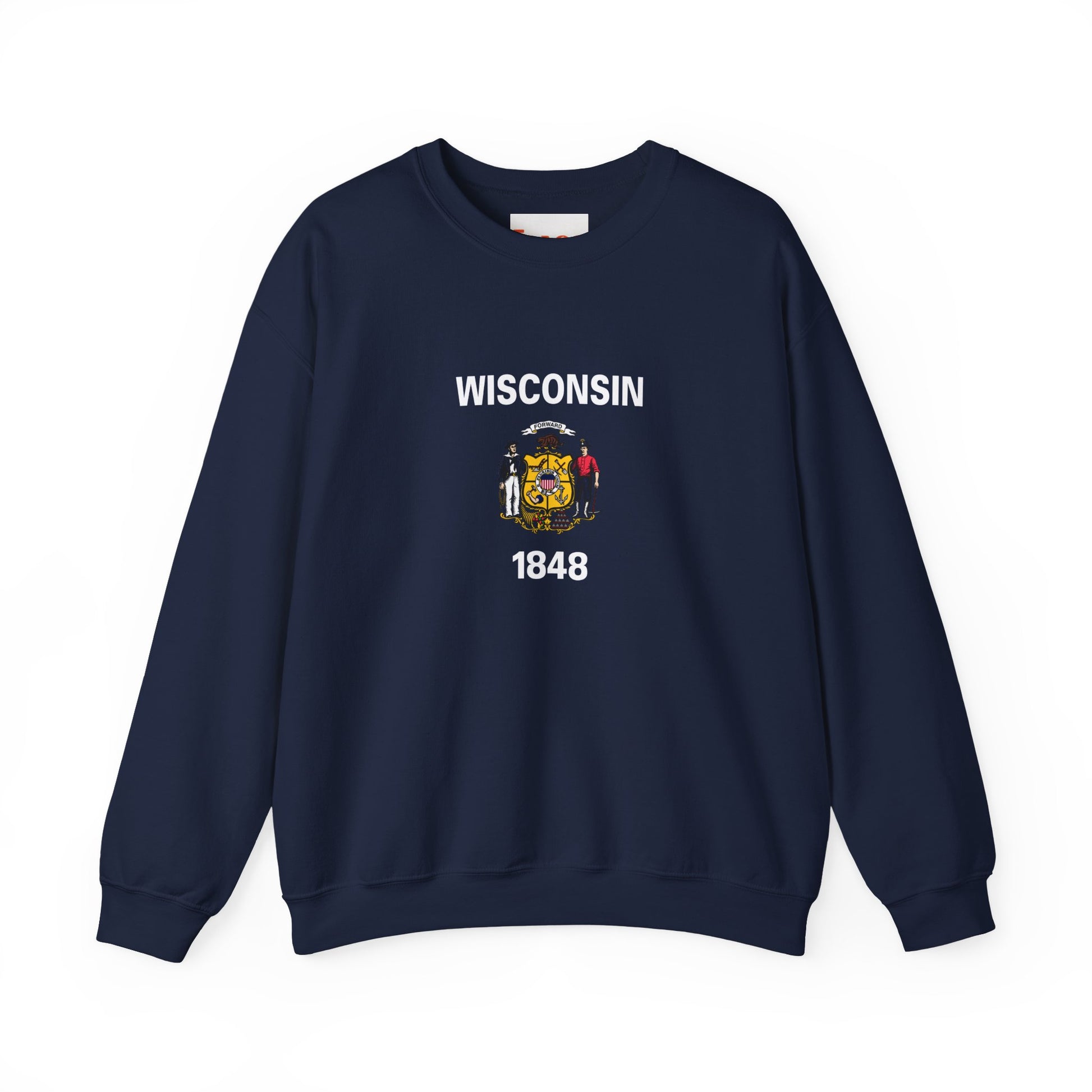 The design is inspired by the Wisconsin state flag, which features the state coat of arms on a deep blue field. The shield depicts a plow, pick and shovel, arm and hammer, and other symbols representing the state’s agriculture, mining, and manufacturing heritage. Supporting the shield are a badger and a sailor, honoring both the state nickname and its early settlers. A red ribbon above the shield bears the state motto “Forward”, reflecting Wisconsin’s progressive spirit. This sweatshirt celebrates the state’s hardworking people, natural beauty, and enduring pride.