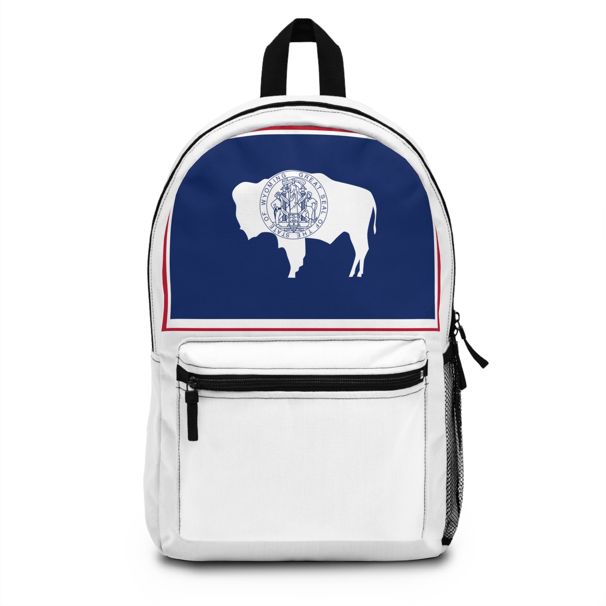 Carry the Cowboy State with pride with the Wyoming Backpack, featuring a design inspired by the Wyoming state flag. The bold flag showcases a white silhouette of a bison against a striking blue field, framed in red. The bison represents the wildlife, strength, and rugged independence of Wyoming, while the colors reflect courage, loyalty, and resilience — core values of the state and its people.