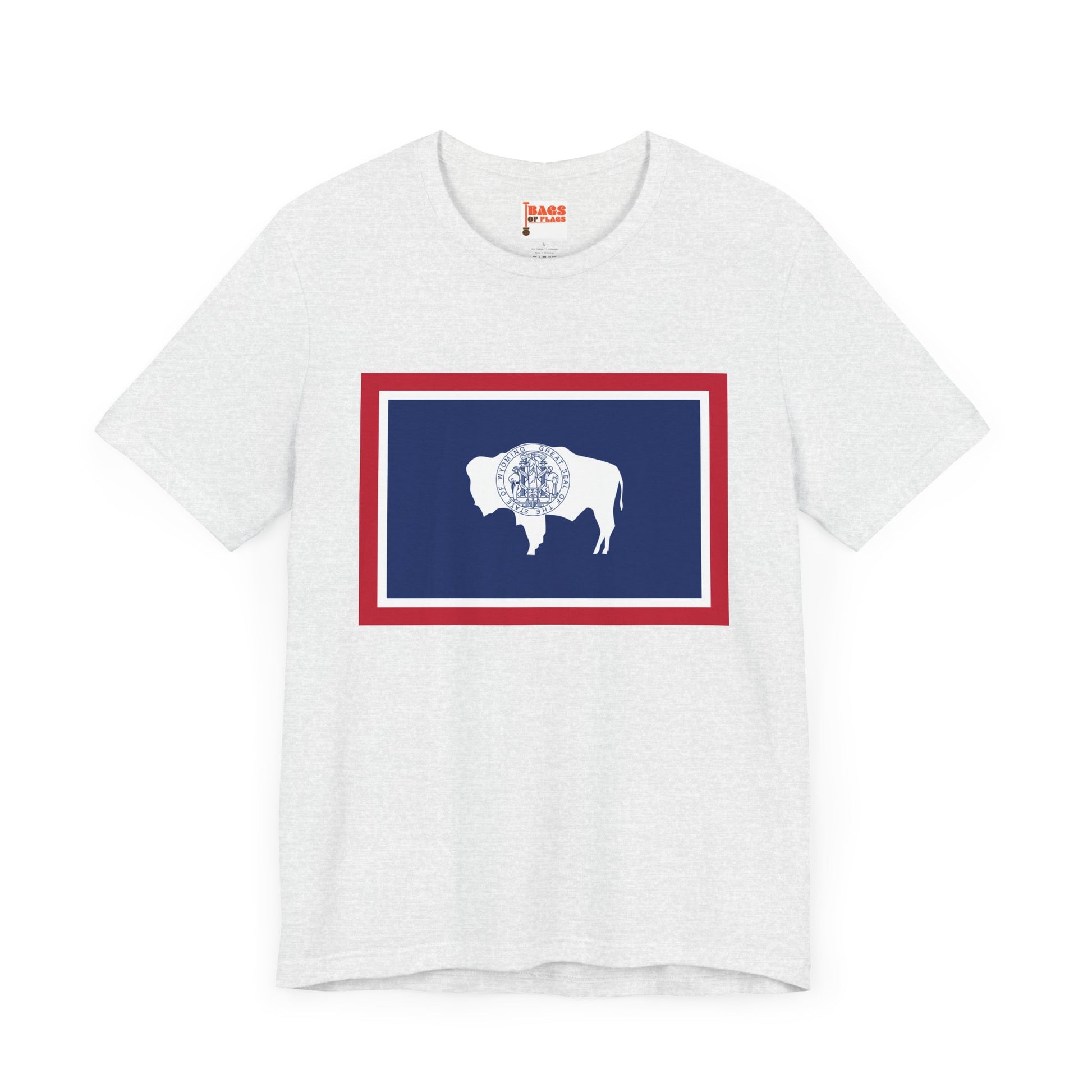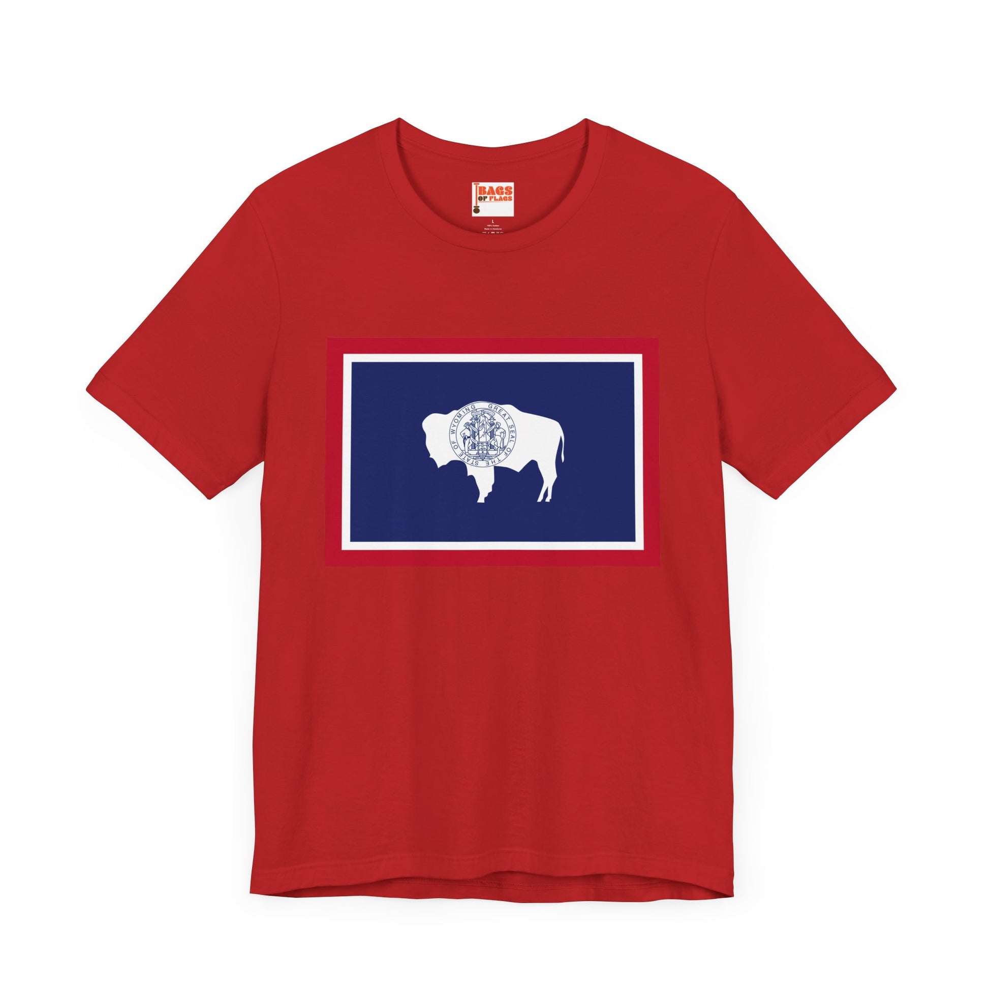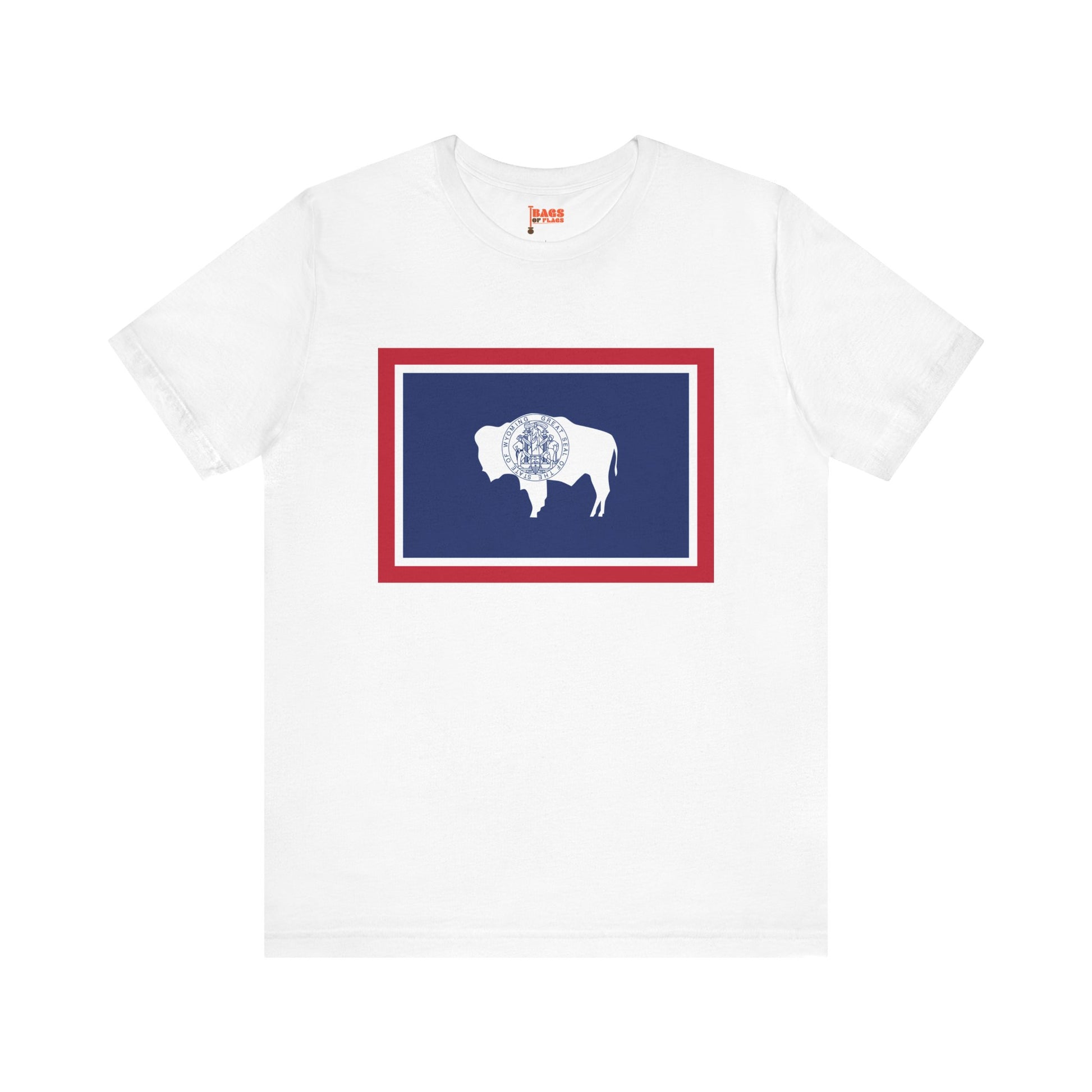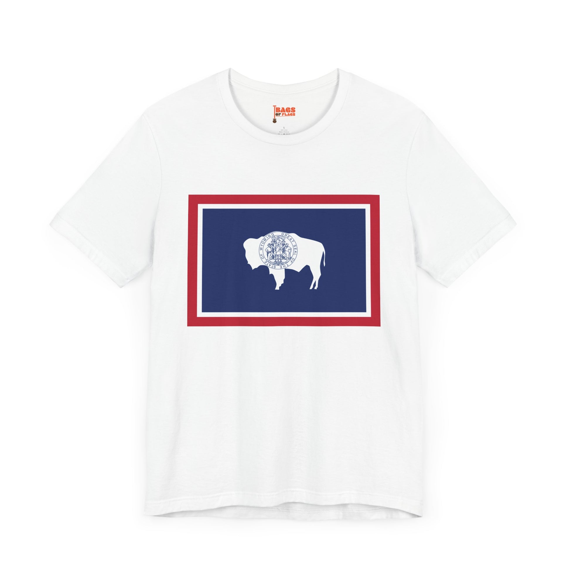The Wyoming Flag T-shirt displays the state’s iconic symbols. The bison silhouette represents Wyoming’s wildlife and pioneering spirit, while the red, white, and blue colors reflect courage, purity, and loyalty. Wearing this tee celebrates the state’s history, natural beauty, and enduring Western pride.